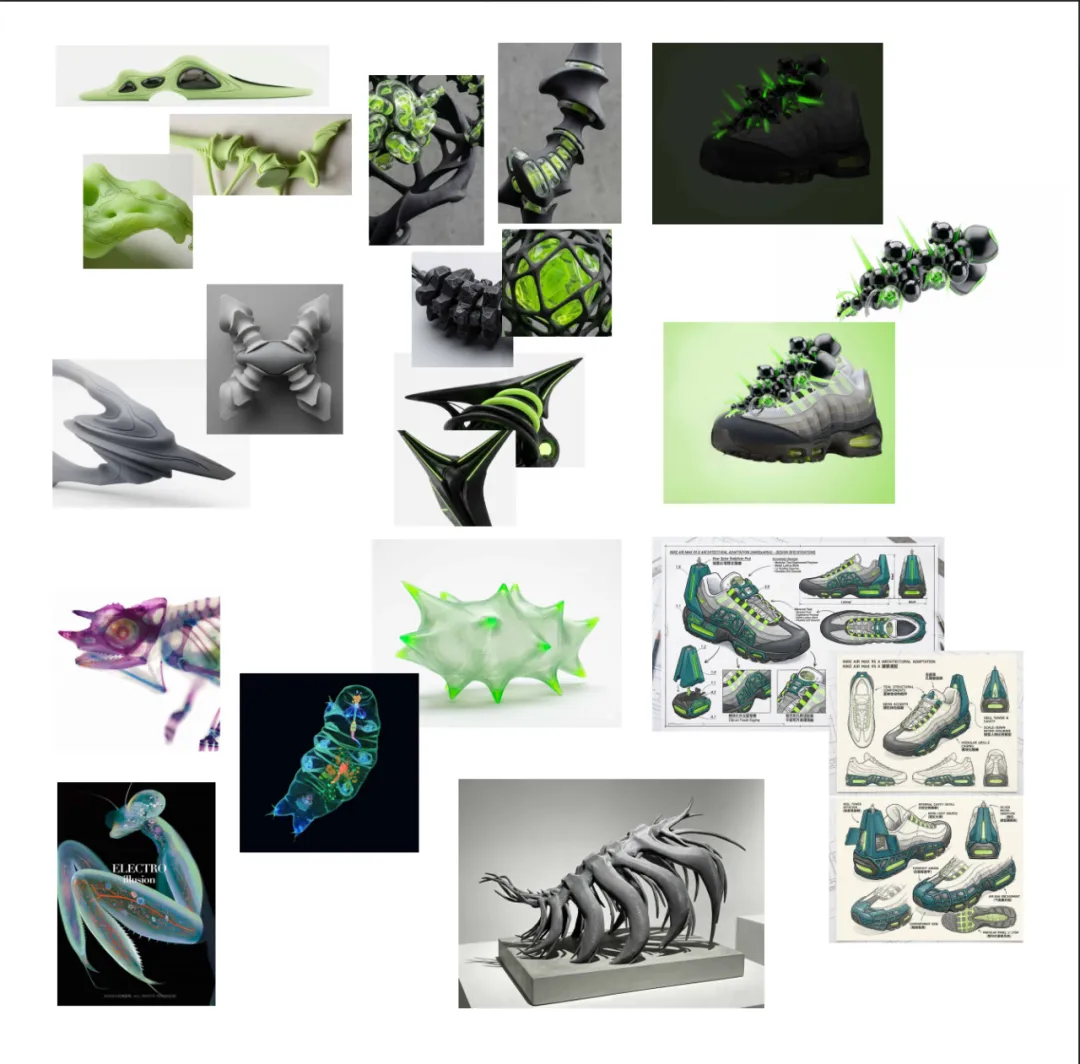 前期制作:大家由骨头与空气两个概念出发进行发散,通过AI工具结合参考案例快速地产出灵感板与概念图。