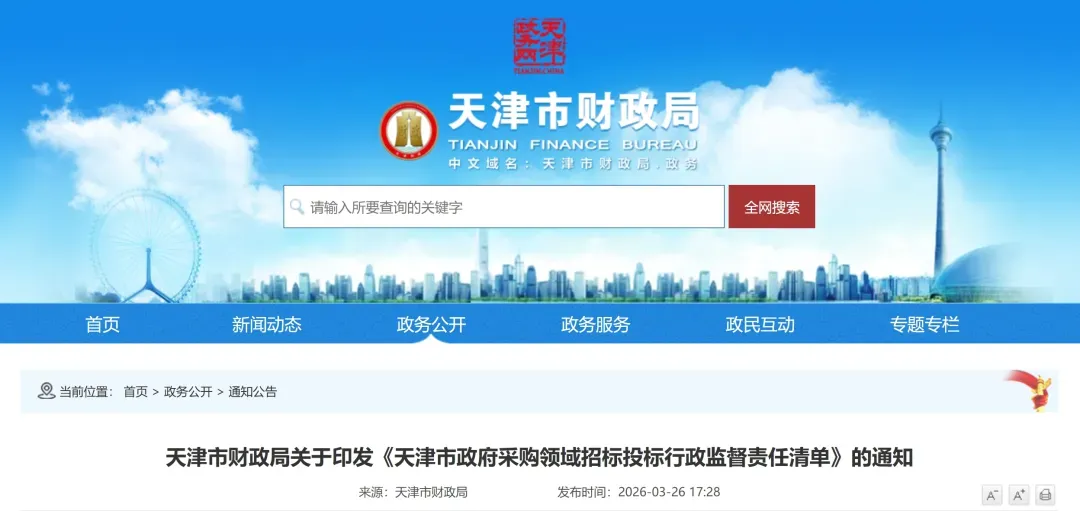 为深入贯彻《国务院办公厅关于创新完善体制机制推动招标投标市场规范健康发展的意见》(国办发〔2024〕21号)和《国务院办公厅关于印发<政府采购领域“整顿市场秩序、建设法规体系、促进产业发展”三年行动方案(2024—2026年)>的通知》(国办发〔2024〕33号)精神,强化政府采购领域招标投标活动监管,根据《中华人民共和国政府采购法》及其实施条例、《政府采购货物和服务招标投标管理办法》(财政部令第87号)等相关法律法规制度要求,我们研究制定了《天津市政府采购领域招标投标行政监督责任清单》,现印发给你们,请遵照执行。