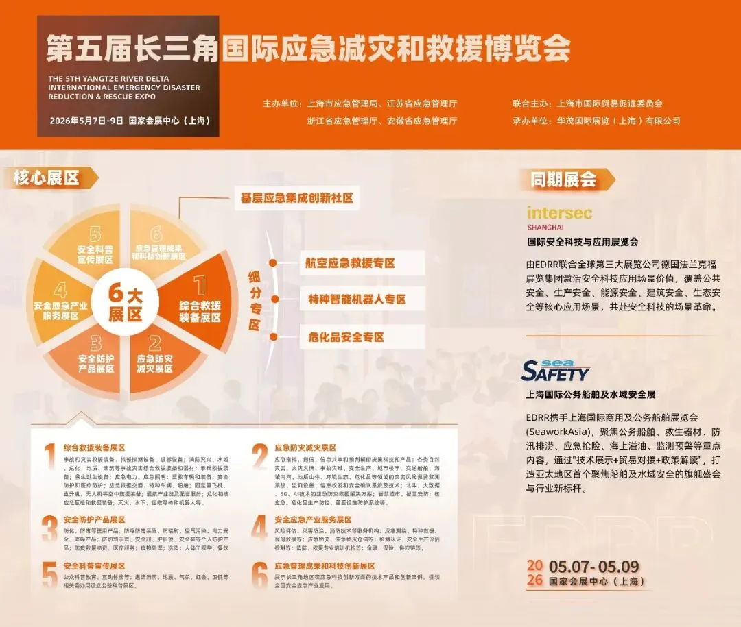 应急防灾减灾展区综合救援装备展区安全防护产品展区产业服务展区科普体验展区应急管理创新成果展区聚焦"大安全,大应急"特设"化工安全专区"、"应急动力专区"、"科技创新展区"同时强化三大特色专区建设:危化品安全专区全新升级,聚焦全生命周期安全管理与应急协同;航空应急救援专区结合低空经济发展,展示无人机、直升机、eVTOL等救援应用生态;特种机器人专区集结消防、巡检、破拆、水下等机器人,展现无人化救援核心力量。