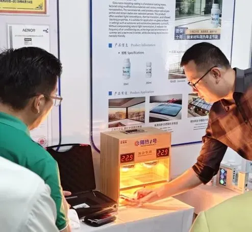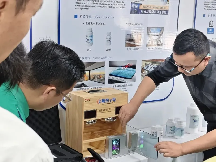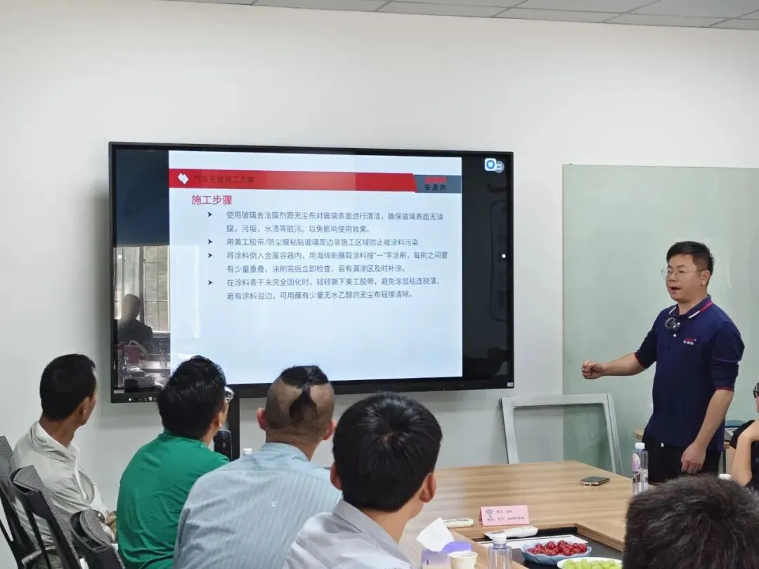 会议伊始,公司员工系统介绍了企业核心优势:依托国家级实验室与十余年研发积累,公司掌握了纳米玻璃隔热涂料关键技术,形成从材料研发到产品应用的完整产业链。同时详细介绍了产品特性:该涂料可阻隔90%以上红外线、55% & 90%以上紫外线,超高透光率,寿命长达10年,远超传统贴膜使用寿命。通过2000小时加速老化测试,无脱落变色现象,安全环保,兼具高效节能与持久稳定性。