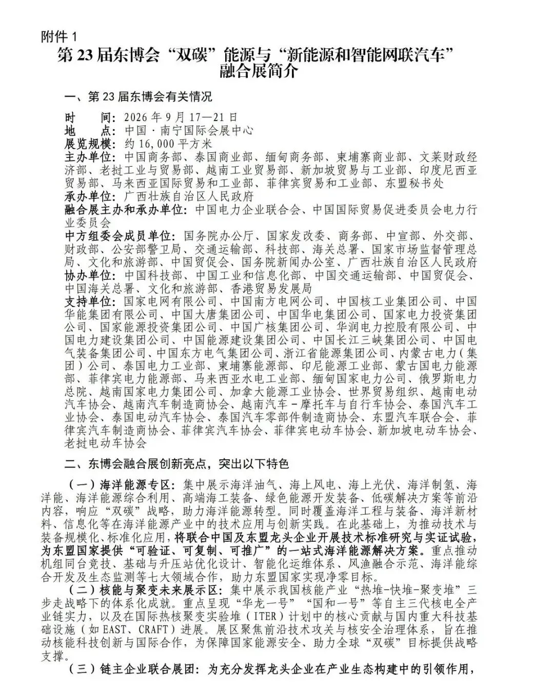中国一东盟博览会(以下简称:“东博会”)是由中国与东盟十国经贸主管部门及东盟秘书处共同主办的国家级,国际性经贸交流盛会。第23届东博会展览面积16万平方米,定于2026年9月17日至21日在广西南宁举办第23届中国一东盟博览会“双碳”能源与“新能源和智能网联汽车”融合展及系列论坛。中国和东盟国家领导人将出席。
