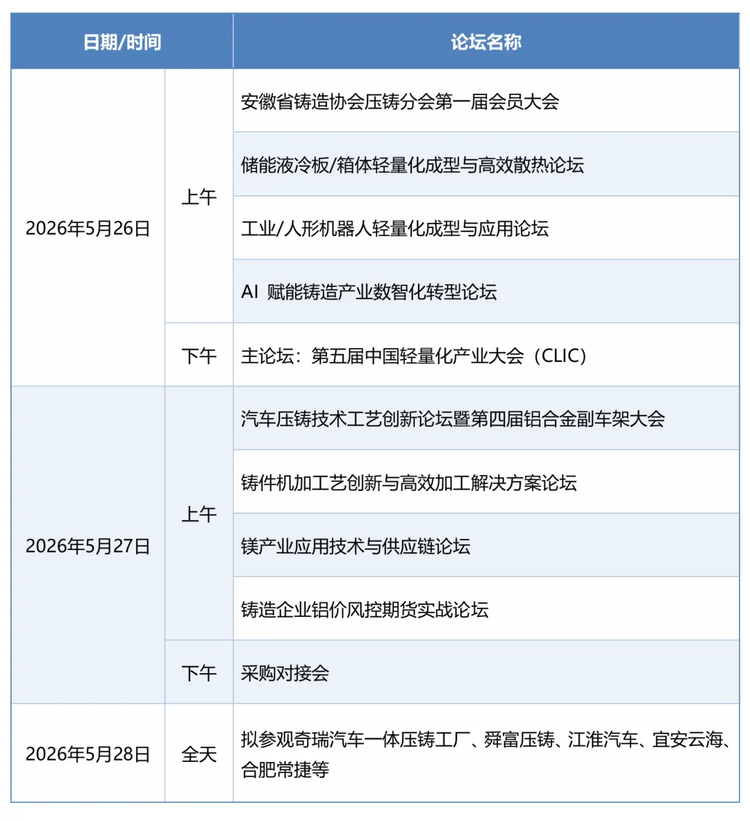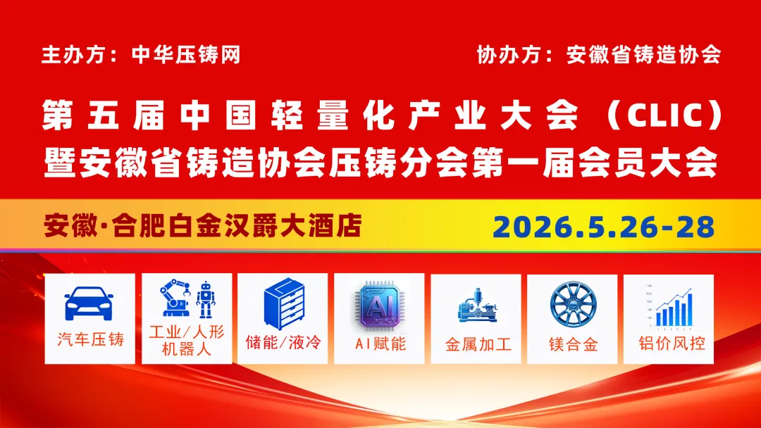 2026年5月26日-28日,由中华压铸网主办、安徽省铸造协会协办的2026第五届中国轻量化产业大会(CLIC)暨安徽省铸造协会压铸分会第一届会员大会将在安徽合肥如期而至。