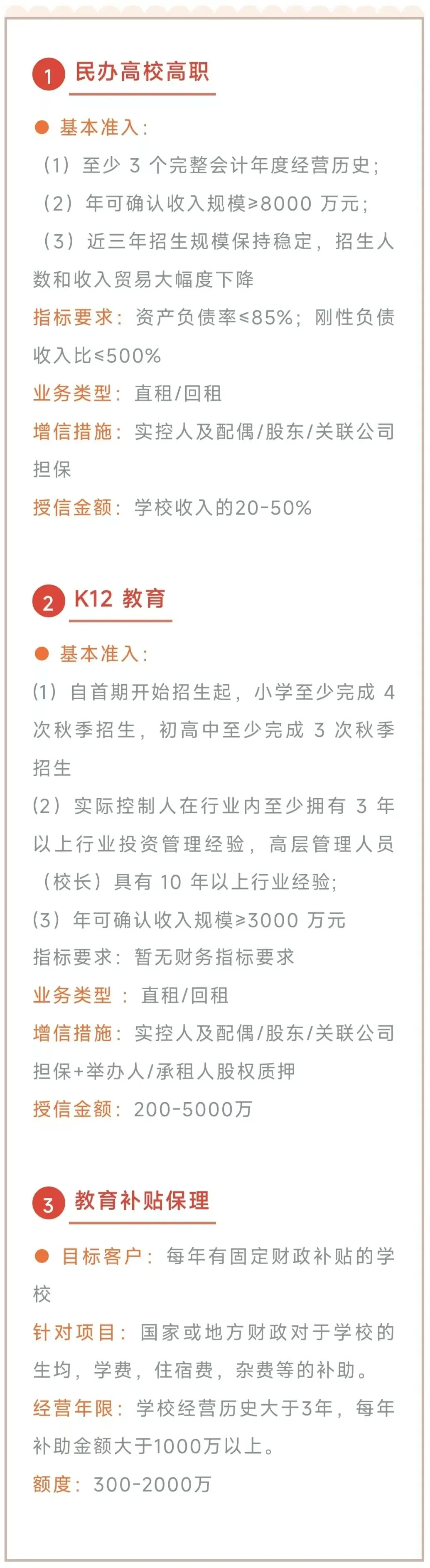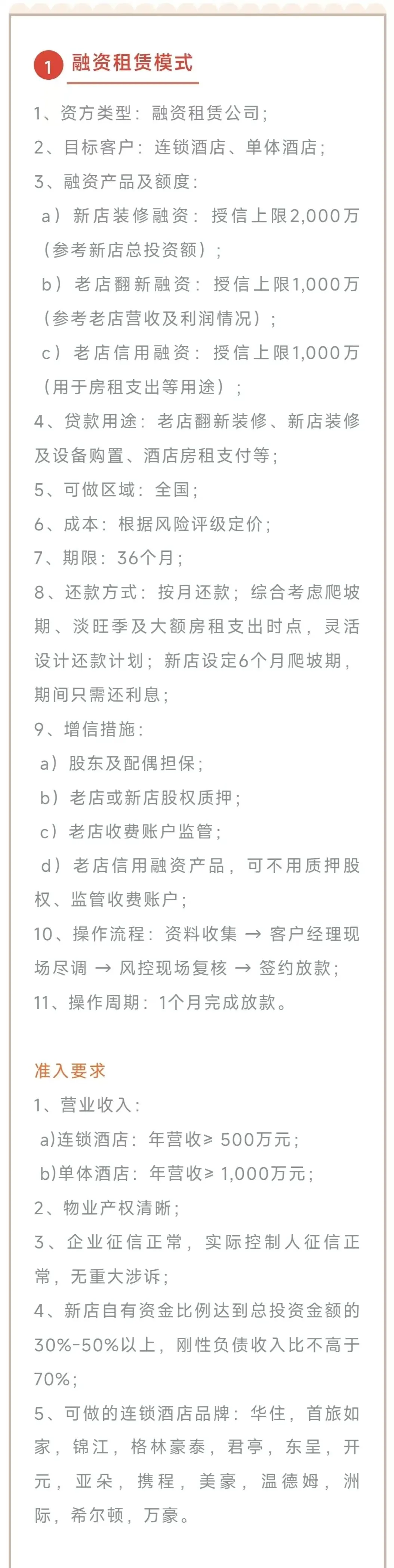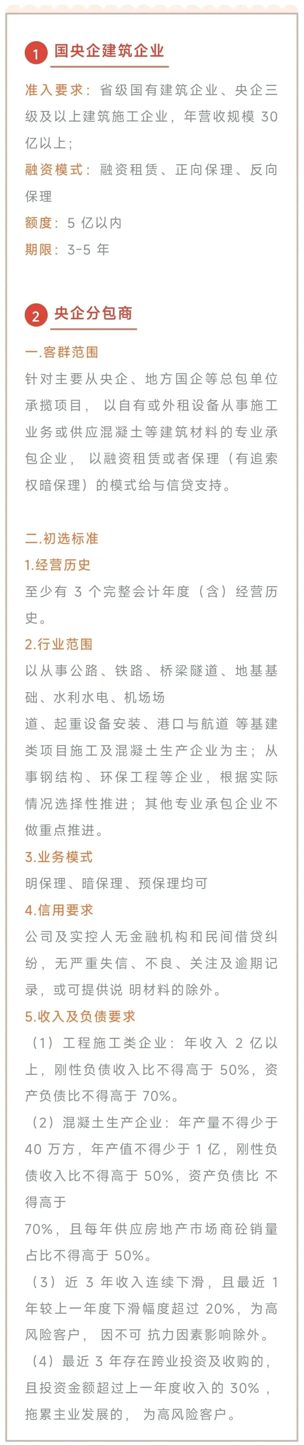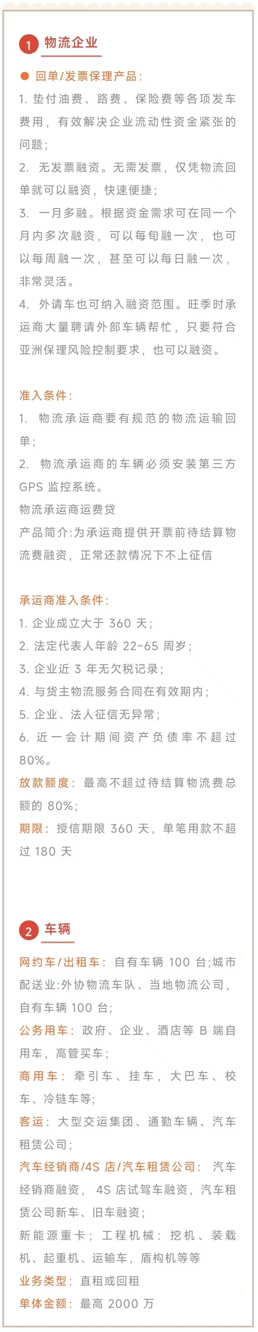 •融资租赁融资:如中小微年收入 1500万 以上,单笔金额100 - 1000万元,且要求资产负债率不能高于70%。如中大型年营收在3个亿以上企业,企业资产负债率不能高于 80%,融资租赁业务需要企业有足够发票设备资产;如是设备更新,可做直租模式用于采购。