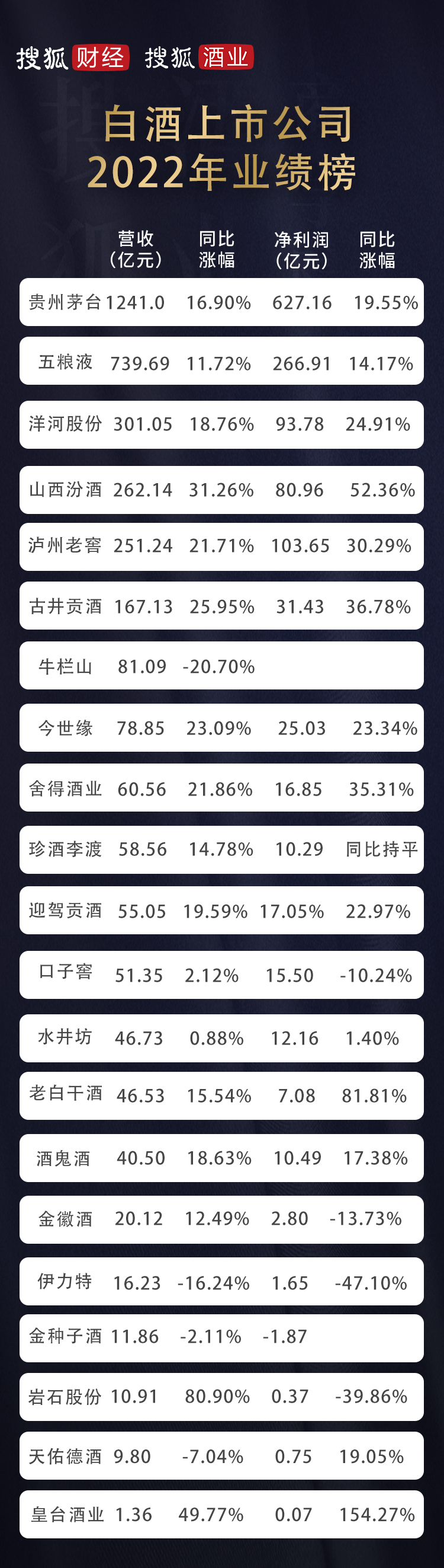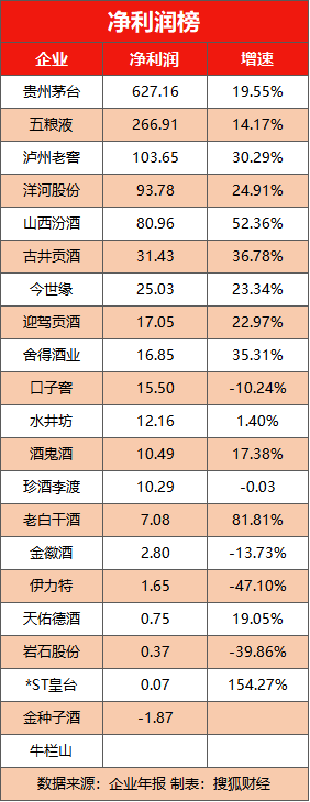 山西汾酒以262.14亿元的营收超过泸州老窖的251.24亿元,二者分列上市白酒企业第四、第五位。