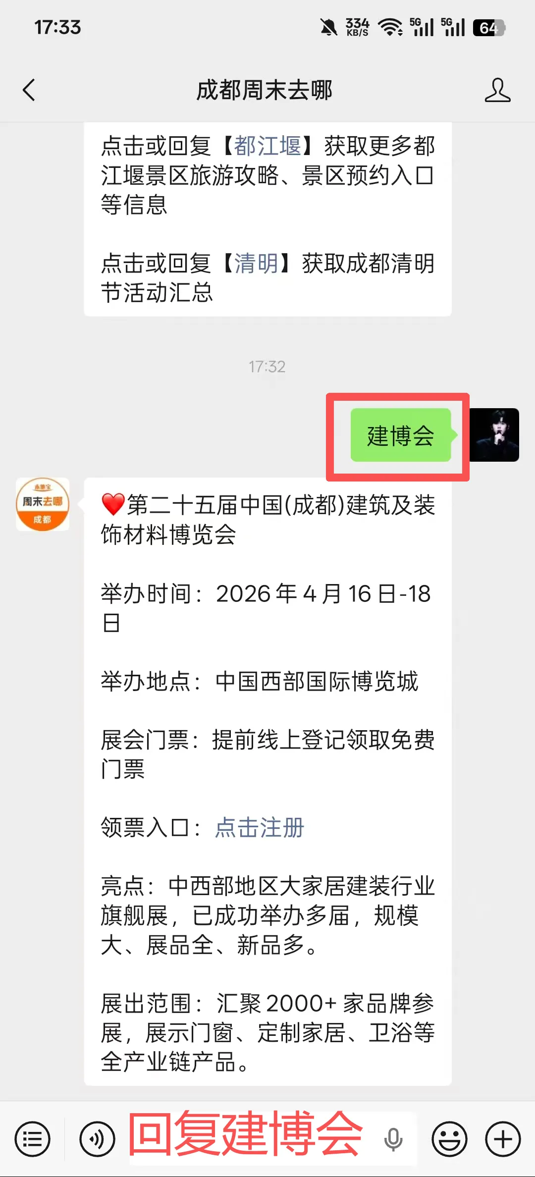 成都建博会免费领票入口:成都建博会CCBD官微,或者扫描下方二维码,进入【成都周末去哪】公众号,在对话框回复【建博会】即可获取成都建博会免费领票入口、逛展攻略。