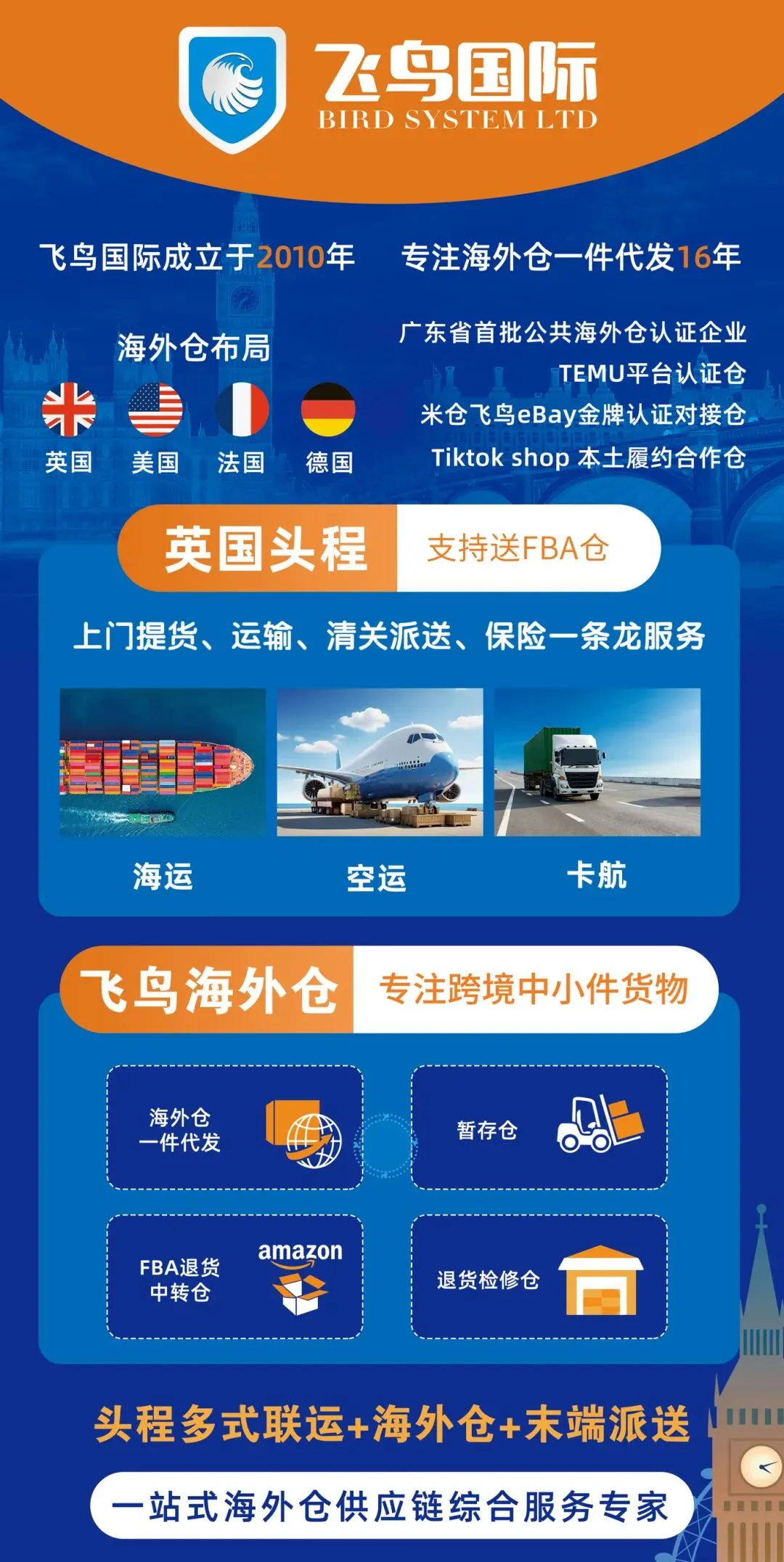 飞鸟国际深耕跨境物流领域,可服务英国头程,以及美国、英国海外仓业务。涵盖空运、海运、卡航多元运输方式,搭配海外仓一件代发服务,提供一站式跨境物流解决方案,精准破解卖家仓储、配送、履约难题。