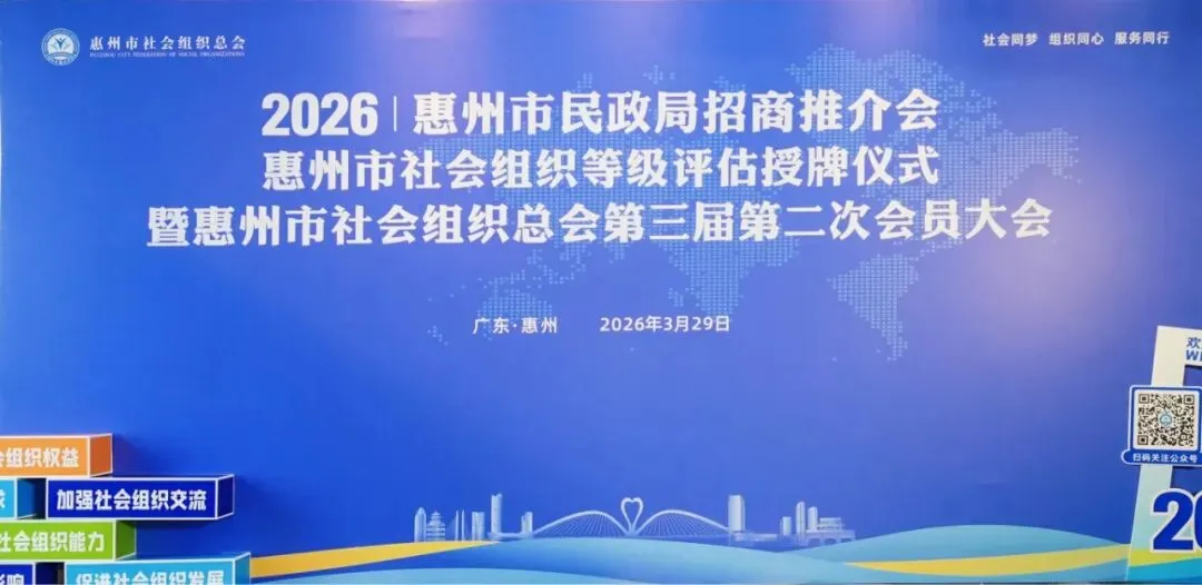 2026年3月29日下午,惠州市民政局招商推介会、惠州市社会组织等级评估授牌仪式暨惠州市社会组织总会第三届第二次会员大会在惠州市惠城区富力万丽酒店三楼宴会厅隆重举行。本次大会汇聚了惠州市各社会组织代表、行业精英及相关领导,议程紧凑、意义深远,既是社会组织总会的重要工作部署,也是市民政局搭建招商平台、规范社会组织发展的关键会议。本会会长郑昌明,执行秘书长兼办公室主任郑宛俞代表我会参加会议。