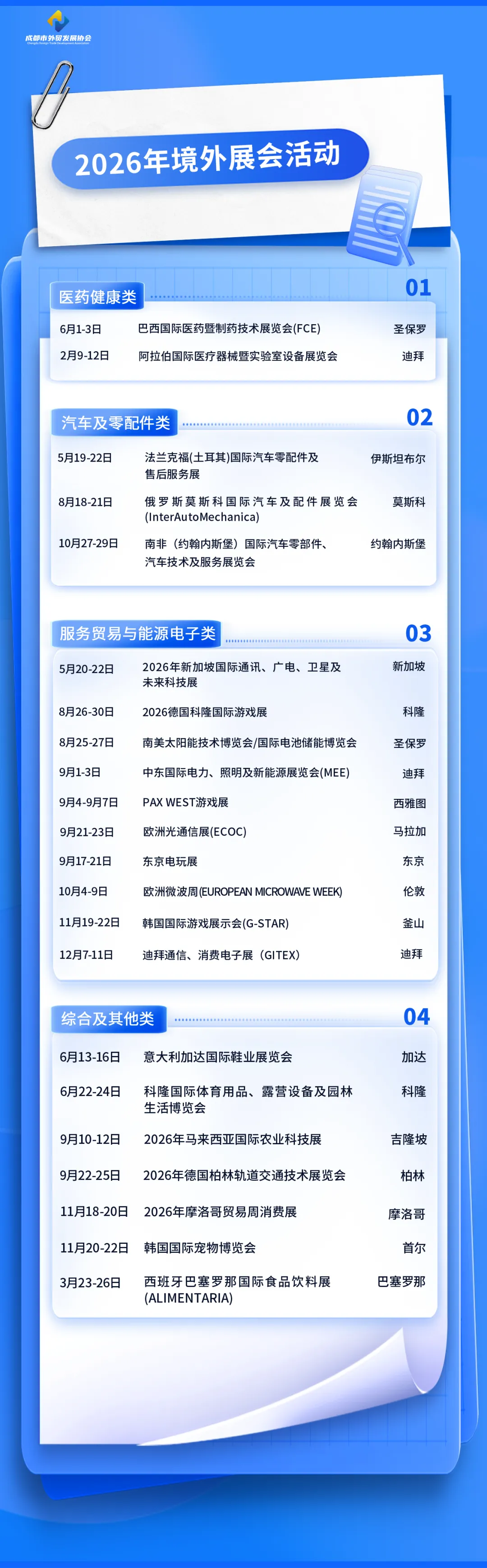 为深入贯彻落实省委、省政府关于扩大高水平对外开放的决策部署,积极响应省商务厅 “川行天下” 品牌战略,2026 年,成都市外贸发展协会秉持 “服务政企、促进发展” 的核心宗旨,组织会员及相关企业赴境外参加专业国际展会,助力企业精准开拓国际市场。现将协会 2026 年度境外展会活动名单公布如下: