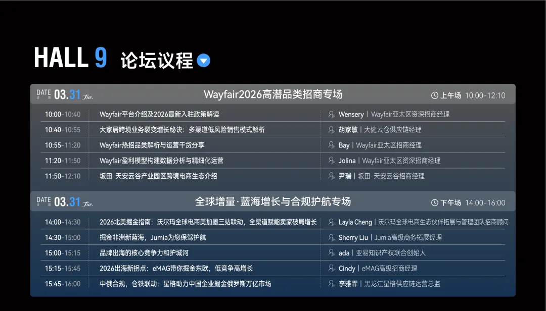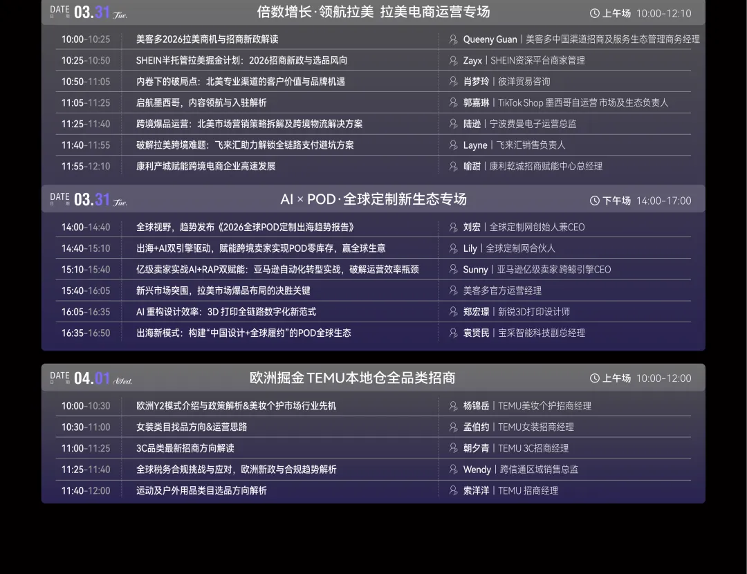 精彩仍在继续。3月31日至4月1日,展会还将带来“AI领航·TikTok跨境AI+内容运营峰会”、“拉美电商运营专场”、“Wayfair高潜品类招商专场”等重磅论坛。更多行业趋势与实操打法,等你现场解锁。欢迎广大跨境人持续关注,共赴这场开年行业盛宴。