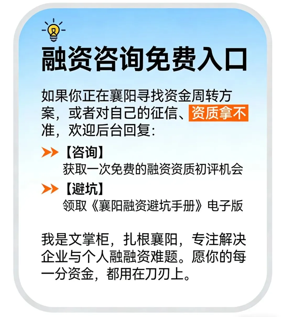 后续我会持续分享襄阳本地融资相关的科普知识、实用技巧,帮大家少走弯路。如果你在企业融资、个人资金周转方面有疑问,想要了解更多适配的产品信息,都可以在公众号后台留言交流。