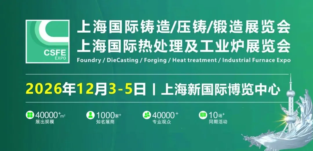 第二十二届上海国际铸造压铸、锻造展览会与第二十二届上海国际热处理及工业炉展览会将于2026年12月3日-5日在上海新国际博览中心 W1馆/W2馆/W3馆(浦东新区龙阳路2345号)举办。届时1000家相关企业齐聚,展览面积40000平方米,超过40000名专业观众。