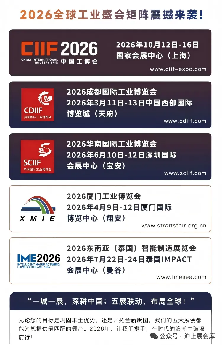 中国工博会组委会深耕工业领域,充分运用品牌优势,联动在厦门、成都、深圳、泰国曼谷、上海、武汉六地举办的工业展会,助力制造业高质量发展迈上新高度,为品牌注入澎湃动力。