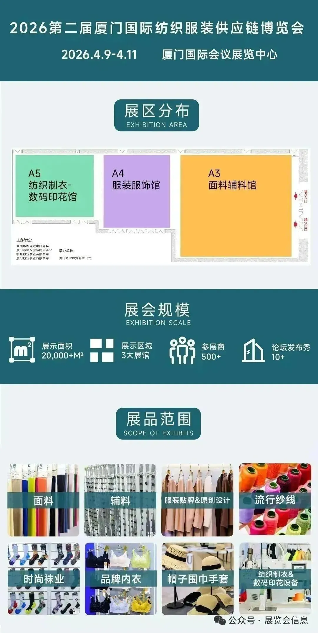 2026第二届厦门国际纺织服装供应链博览会正式定档!博览会将在2026年4月9-11日,于厦门国际会议展览中心启幕。