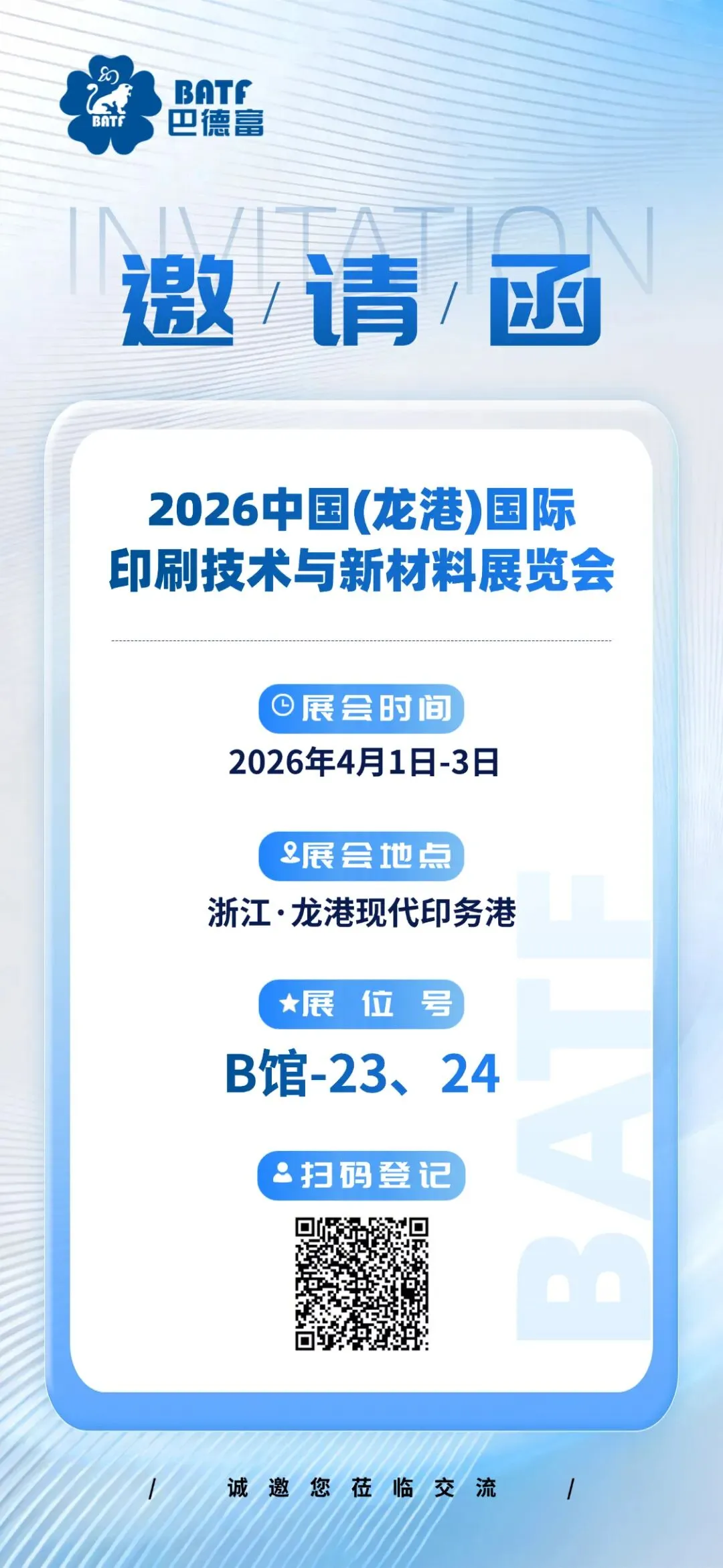 2026年4月1日至3日,2026中国(龙港)国际印刷技术与新材料展览会将在浙江龙港现代印务港举行,巴德富将携印刷包装全场景的绿色胶粘解决方案亮相B馆-23、24展位,与行业同仁共探印刷产业高质量发展新路径!