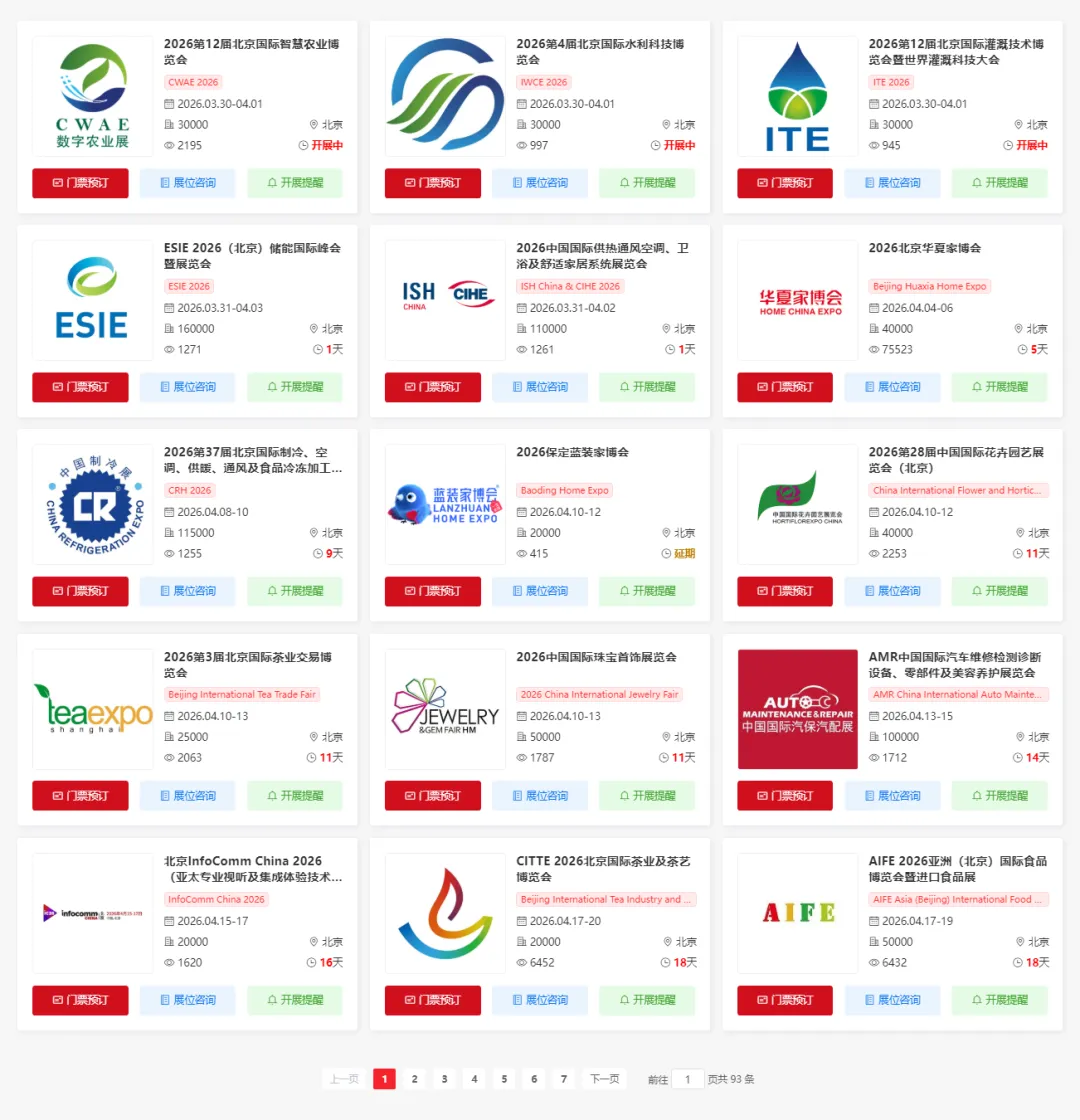 2026年4-12月北京将举办多场重要的展会活动,涵盖了农业、水利、智能家居、能源、家具、制冷、花卉、珠宝、茶叶、汽车、声学、茶叶、加盟、食品、广告、餐饮、文化、教育、工业、环保、保健、园林、健康、汽车、文化、电力展等多个领域。小编为大家整理了4-12月北京展会排期表,希望能帮助你规划行程。大多门票限时免费