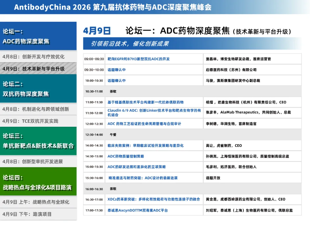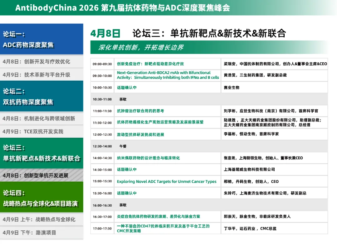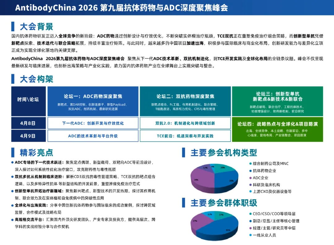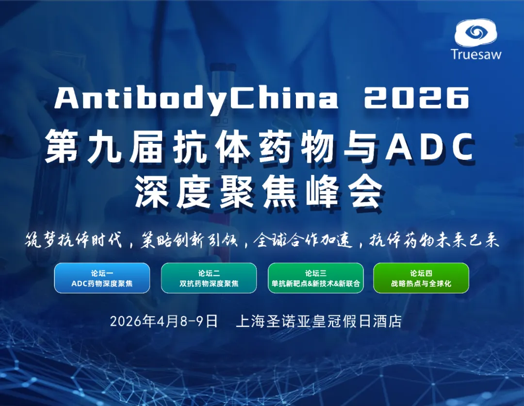 2026年4月8日~9日,Antibody China 2026第九届抗体药物与ADC深度聚焦峰会将于上海圣诺亚皇冠假日酒店举行。