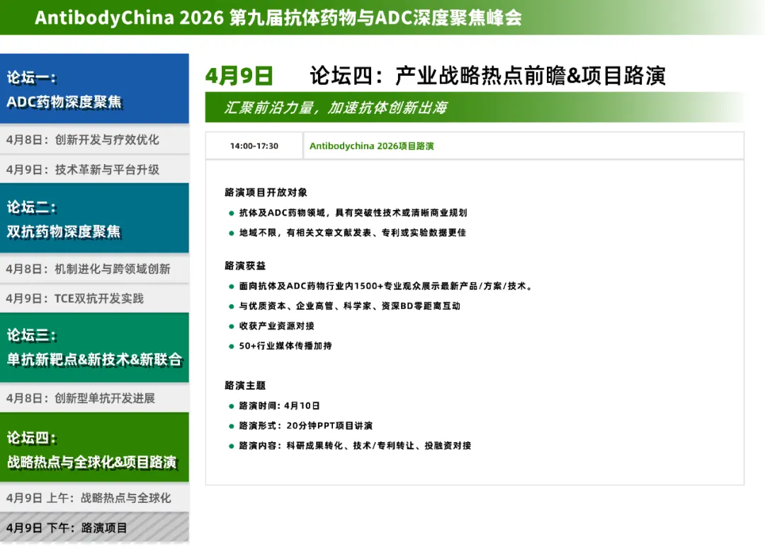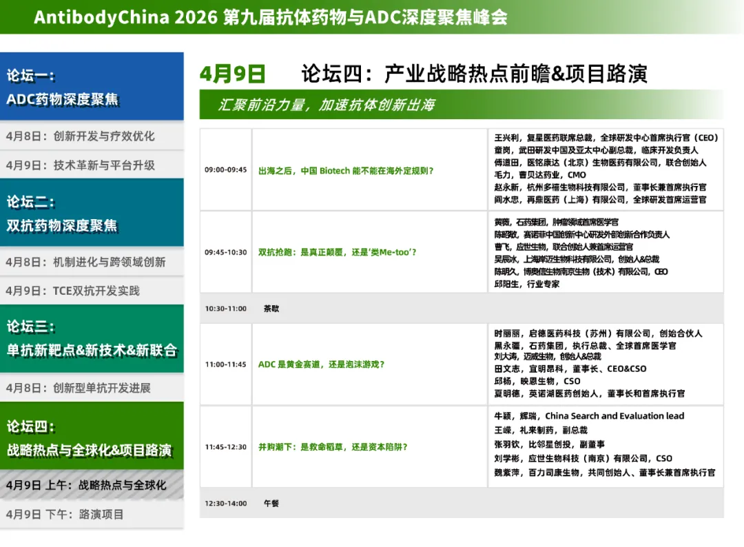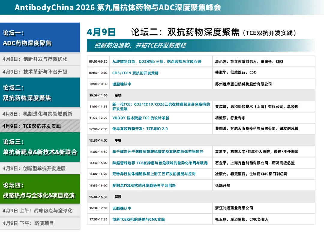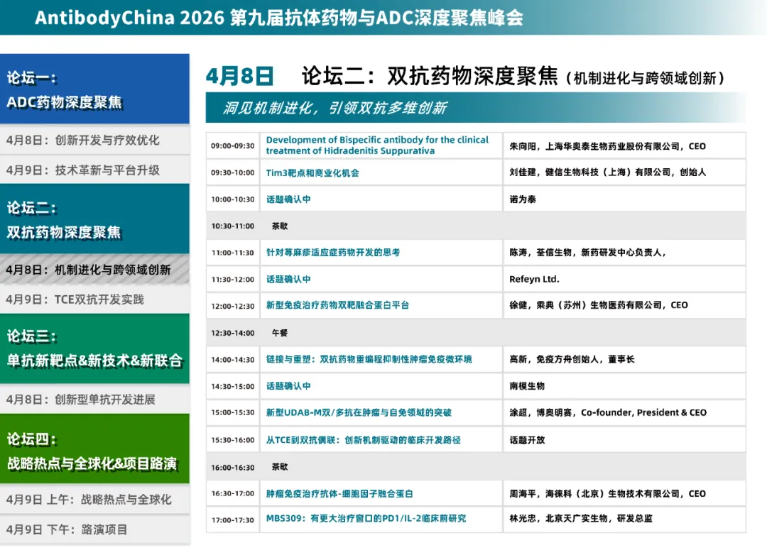 2026年4月8日~9日,Antibody China 2026第九届抗体药物与ADC深度聚焦峰会将于上海圣诺亚皇冠假日酒店举行。
