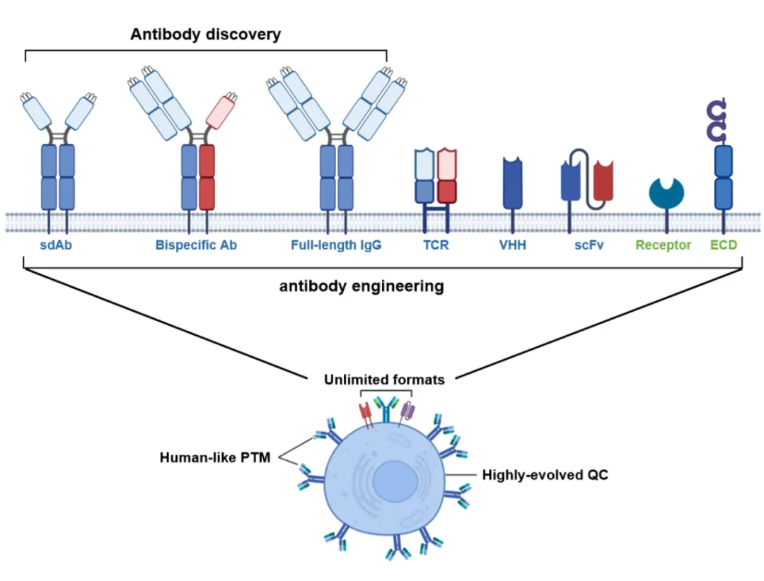纳博生命科技拥有从抗原制备(多肽、蛋白及RNA),到抗体发现和抗体工程,再到生物学功能验证/筛选的全链路技术服务平台。其中RNA抗原包括线性、环状和自复制三种类型RNA,并且针对羊驼免疫进行独特的结构和序列双重优化设计;抗体发现和抗体工程服务采用改良噬菌体展示和哺乳动物细胞展示等多种技术路线,满足不同的服务需求。多技术平台的交叉互补为药企及科研院所提供灵活的抗体发现及工程改造服务,助力抗体药的研发。
