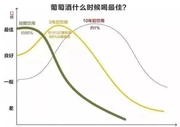 划重点了朋友们!由图可见,90%的葡萄酒最佳适饮期都在一两年内。