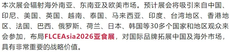 FLCEAsia2026亚食展,展会倾斜高端食品食材及进口食品食材,立足中国,链接全球,依托数字化办展新模式为用户提升价值,是专为高端食品食材企业,提供集中展示最新前沿信息的国际化平台。
