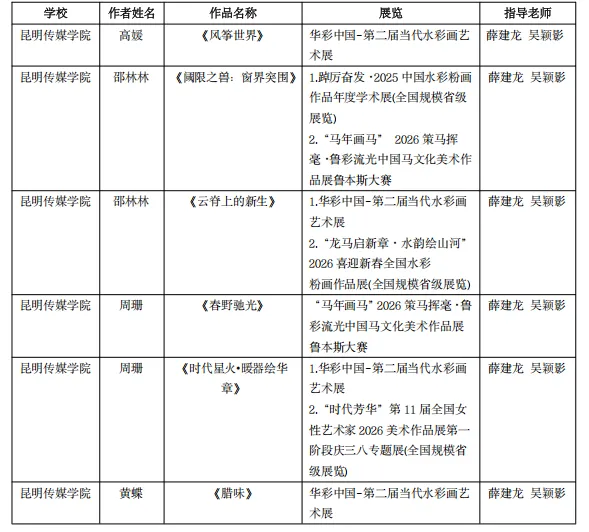 近日,昆明传媒学院美术与设计学院美术学(师范类)专业水性材料方向高媛等四名学子的作品成功入选省级各类水彩展览,充分展现了学院对美术师范人才培养的扎实功底与艺术创新的成果,彰显出青年学子在水性材料创作与美育实践中的综合素养。水性材料方向是美术学(师范类)首次开设的专业方向,本次参展学子为该方向首届培养的大三学生,专业课程全程以创作为核心,聚焦创作实践与能力培养,此次阶段性创作成果的落地,尽显学子良好的专业素养与创新意识。