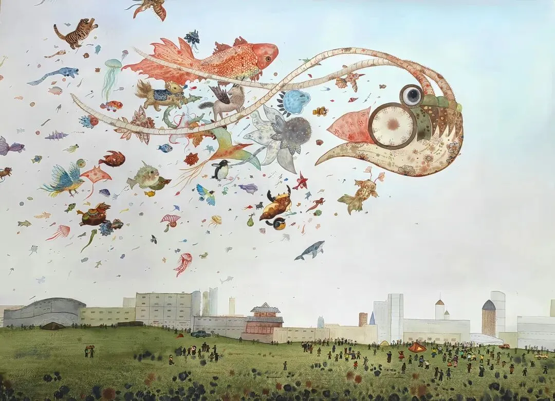 作品以山东潍坊风筝节为灵感,借水性材料的通透质感,将奇幻生物与飞鱼、瑞兽、飞鸟等生灵化作空中风筝,在城市上空舒展遨游,既呼应民俗浪漫,也传递传统在当代生长的内核,承载对自由与创造力的向往。