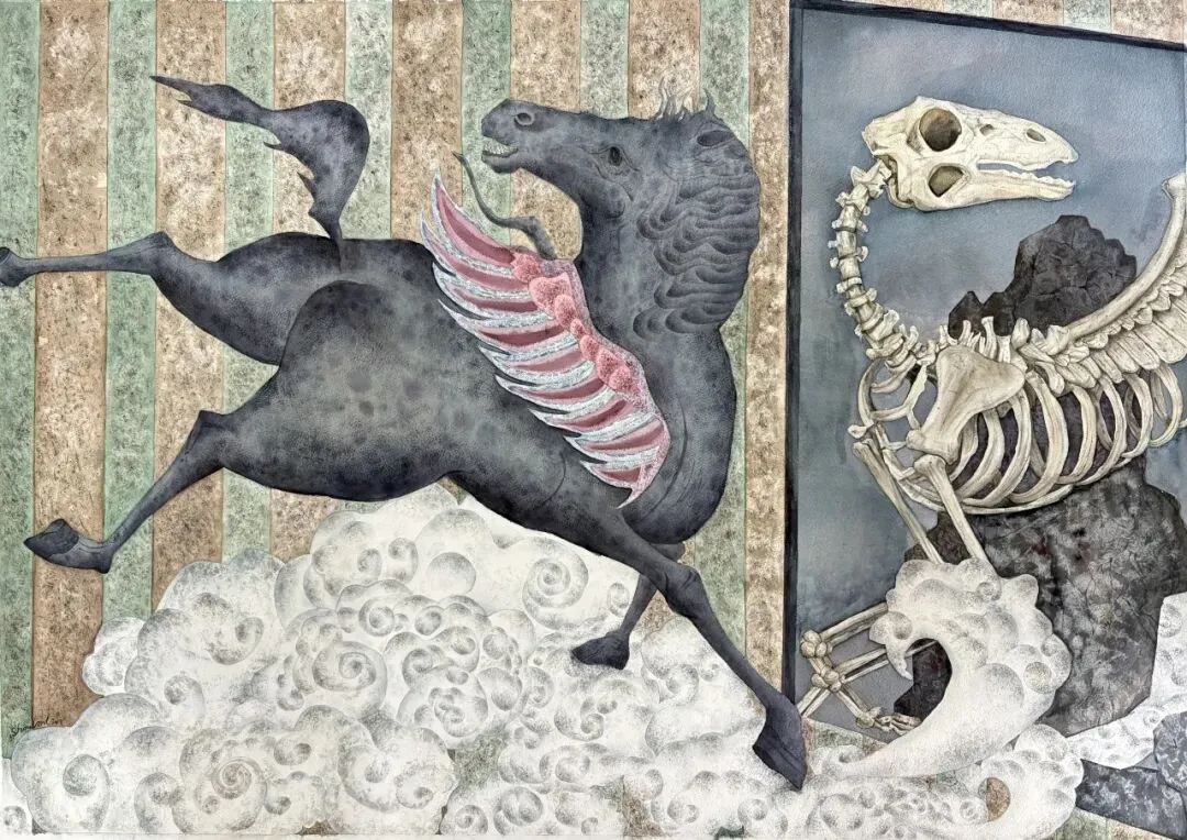 《云脊上的新生》:画面以活马与骸骨的并置,隐喻脱胎换骨的生命历程。活马踏云奔腾、翅羽张扬,是挣脱过往桎梏后的热烈奔放;一旁的骸骨则是旧我沉淀的印记。在新生与过往的对话中,完成向自由与力量的蜕变,奔赴滚烫的新生。