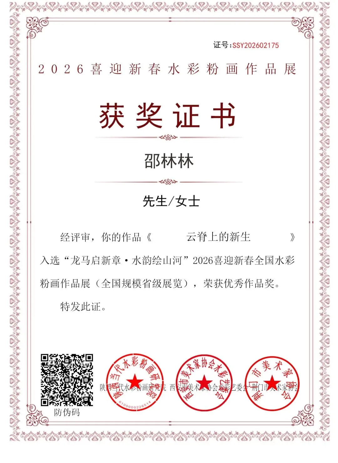 入选展览 2:“龙马启新章·水韵会山河” 2026喜迎新春全国水彩粉画作品展(全国规模省级展览)