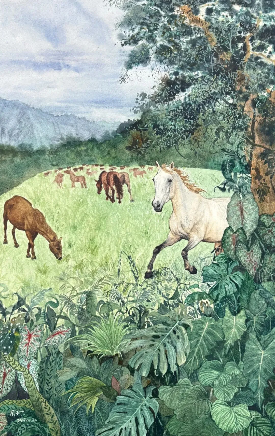《春野驰光》以水性材料为媒介,在葱郁的热带植被与远山之间,铺展群马自在栖居的图景。白马的奔跃与棕马的静憩形成动静对照,既传递自然生命的蓬勃张力,也暗含当代人对生态共生、诗意栖居的向往,在透明通透的水色中,重构人与自然和谐共处的理想场域。