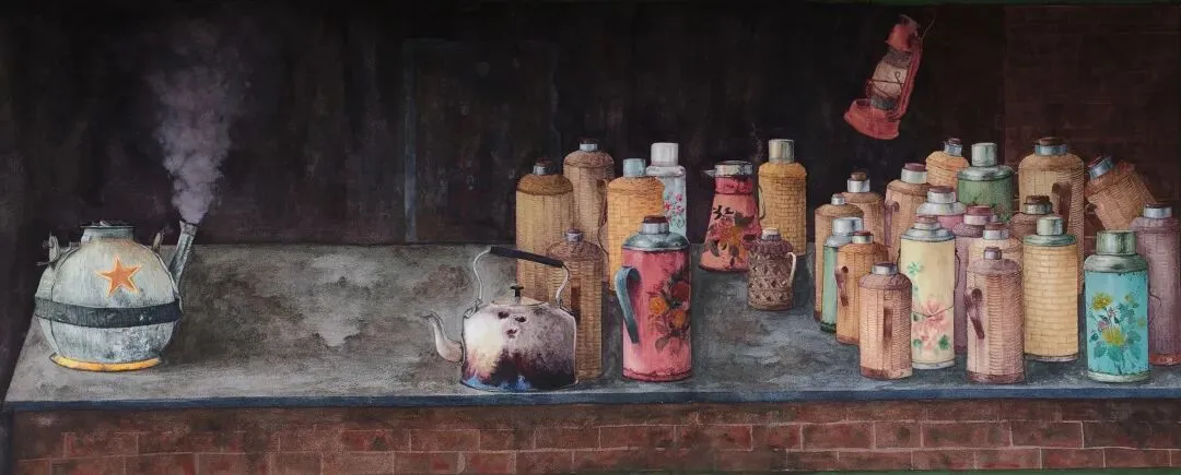《时代星火•暖器绘华章》以旧暖壶与老水壶为视觉核心,用沉郁的水色晕染出时代质感。竹编外壳、褪色花饰与斑驳锈迹,承载着集体记忆与生活温度,在烟火气的氤氲中,回望朴素年代的温情与韧性,也以怀旧视角叩问当代人对日常诗意、情感联结的珍视与追寻。