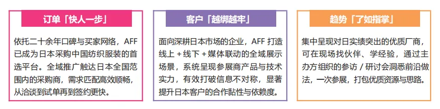 日本是中国纺织品服装第二大出口市场,超60%的日本纺织服装源自中国。近年来,日本纺织服装进口额持续保持增长,加之 RCEP生效进一步巩固了中国企业在日本市场的价格与供给优势。AFF因此成为中国企业开拓日本、链接专业采购商的关键窗口。