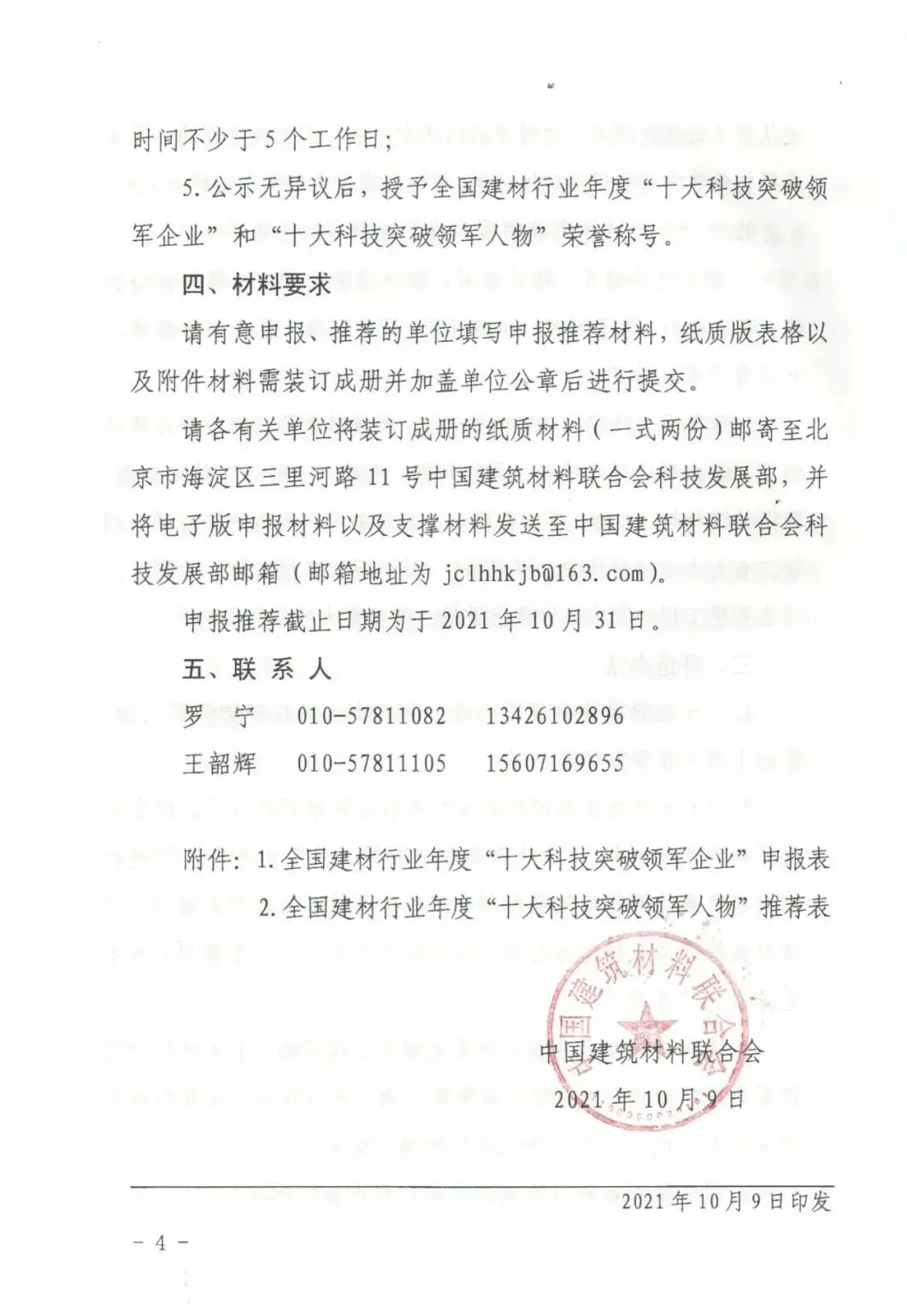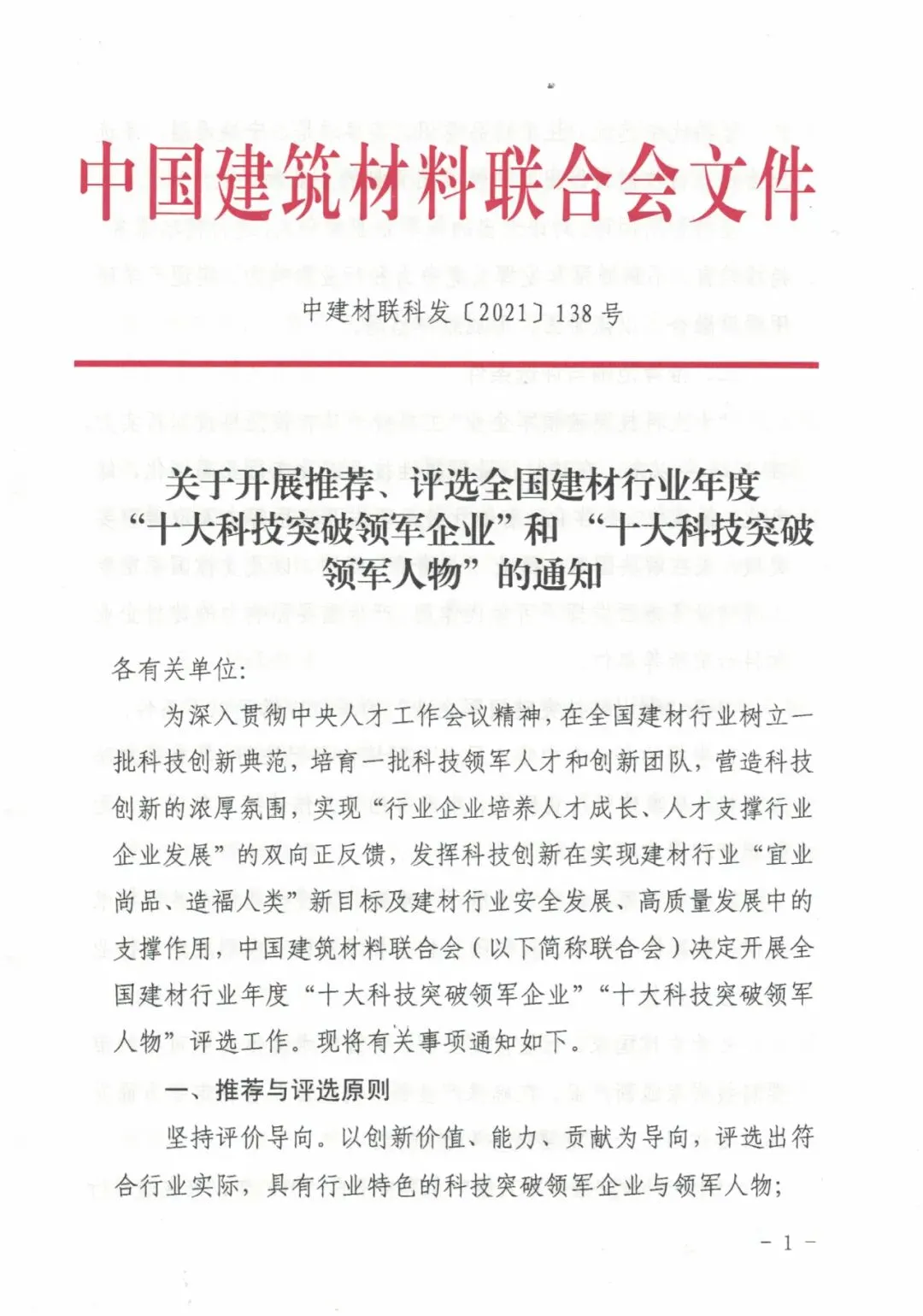全国建材行业年度“十大科技突破领军企业”和 “十大科技突破领军人物”开始申报