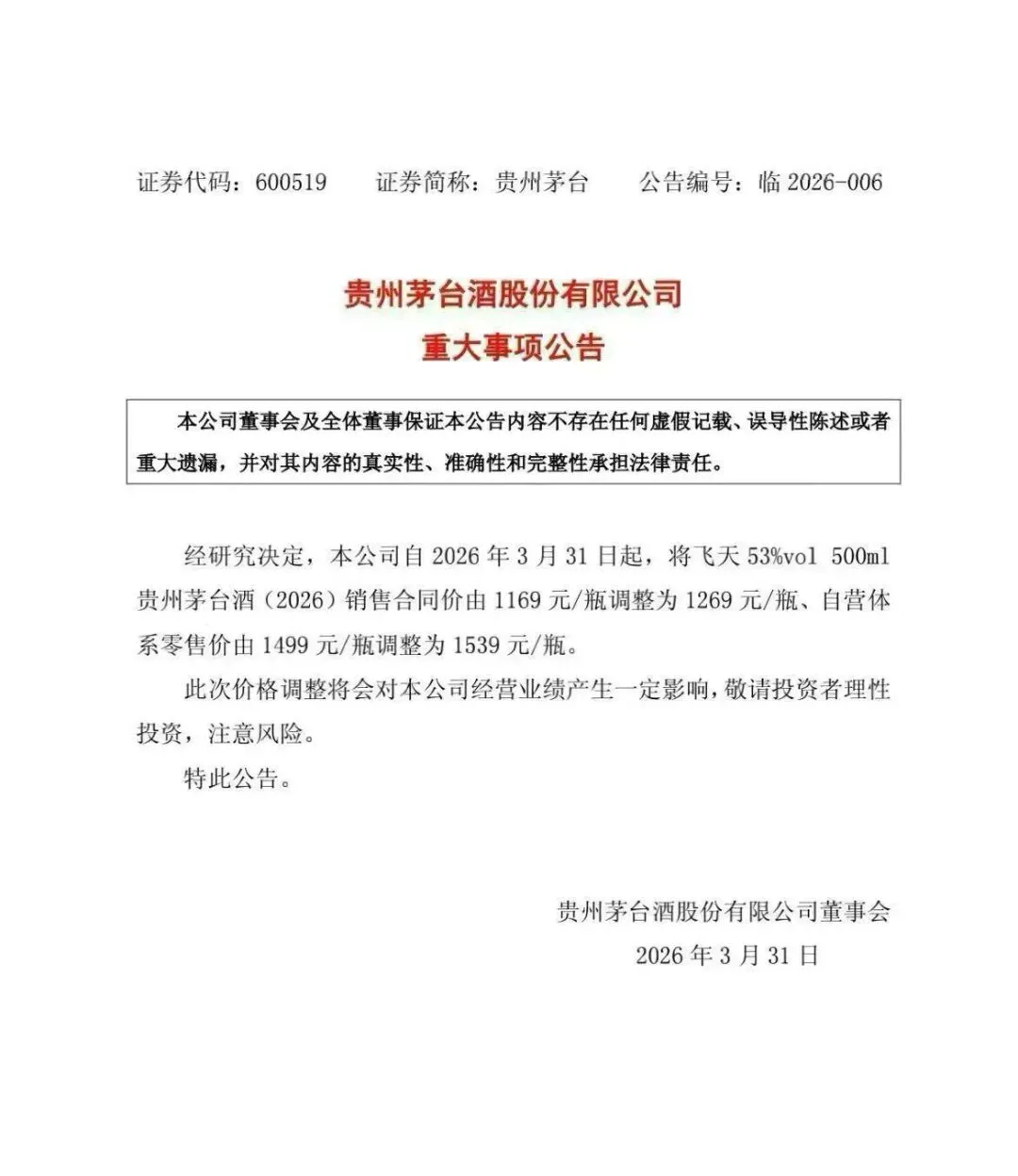 2026年3月30日晚间,贵州茅台正式发布公告,宣布自3月31日起对核心产品价格进行调整,53度500ml飞天茅台销售合同价(出厂价)从1169元/瓶上调至1269元/瓶,涨幅约8.55%;自营体系零售价从1499元/瓶上调至1539元/瓶,涨幅约2.67%。此次涨价是茅台时隔两年半再度调整出厂价,更是时隔8年首次上调官方零售价,不仅牵动白酒行业神经,更成为消费市场、资本市场关注的焦点。作为白酒行业的绝对龙头,茅台系列酒此次调价绝非简单的价格上浮,而是企业战略、市场供需、行业趋势多重因素交织的结果,其背后的逻辑与影响值得深度剖析。