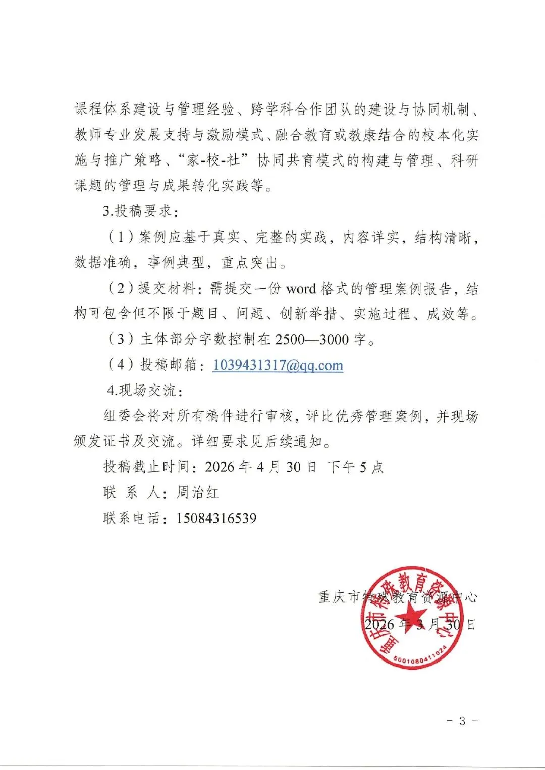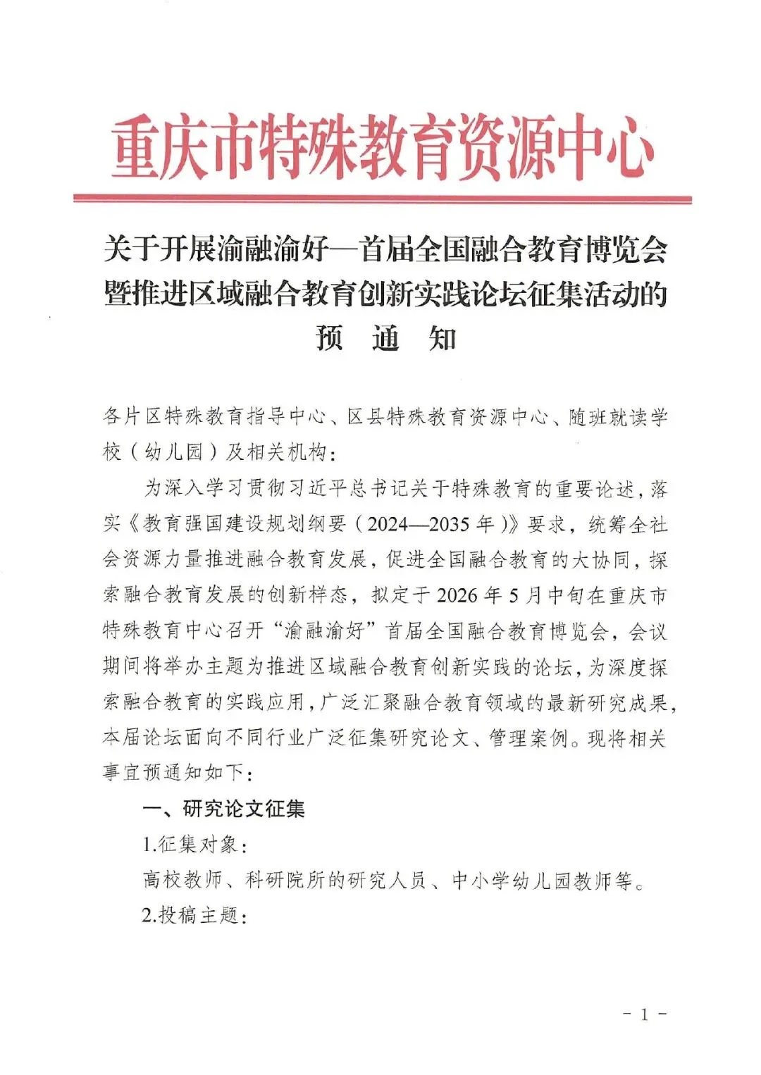 为深入学习贯彻习近平总书记关于特殊教育的重要论述,落实《教育强国建设规划纲要(2024—2035年)》要求,统筹全社会资源力量推进融合教育发展,促进全国融合教育的大协同,探索融合教育发展的创新样态,拟定于2026年5月中旬在重庆市特殊教育中心召开“渝融渝好”首届全国融合教育博览会,会议期间将举办主题为推进区域融合教育创新实践的论坛,为深度探索融合教育的实践应用,广泛汇聚融合教育领域的最新研究成果,本届论坛面向不同行业广泛征集研究论文、管理案例。现将相关事宜预通知如下:
