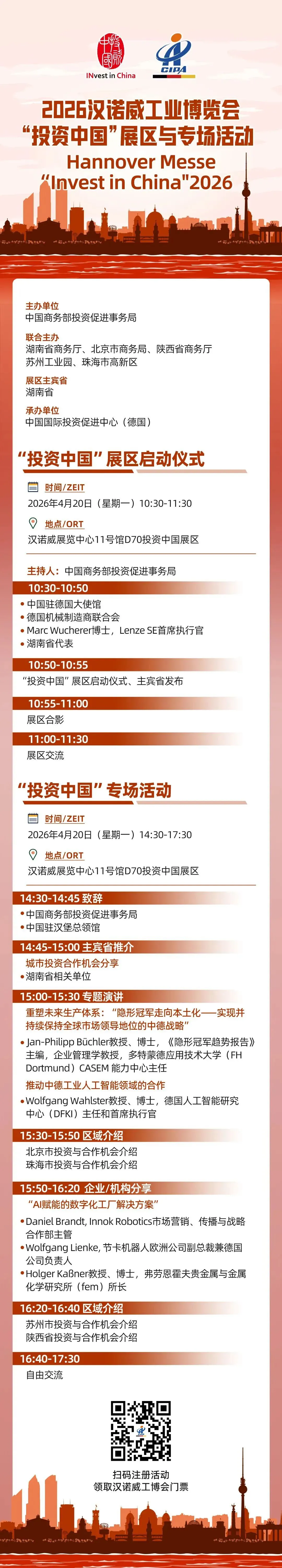 4月20日至4月26日德国汉诺威工业博览会举办期间,中国国际投资促进中心(德国)将举办“投资中国”系列活动,此活动已举办数届,成为世界了解中国、投资中国的重要窗口。
