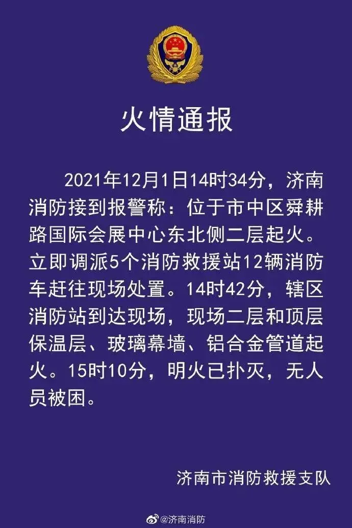 2021年12月1日,济南消防官方微博发布警情通报:2021年12月1日14时34分,接到报警称,位于济南市市中区舜耕路国际会展中心东北侧二层起火。立即调派5个消防救援站12辆消防车赶往现场处置。14时42分,辖区消防站到达现场,现场二层和顶层保温层、玻璃幕墙、铝合金管道起火。15时10分,明火已扑灭,无人员被困。
