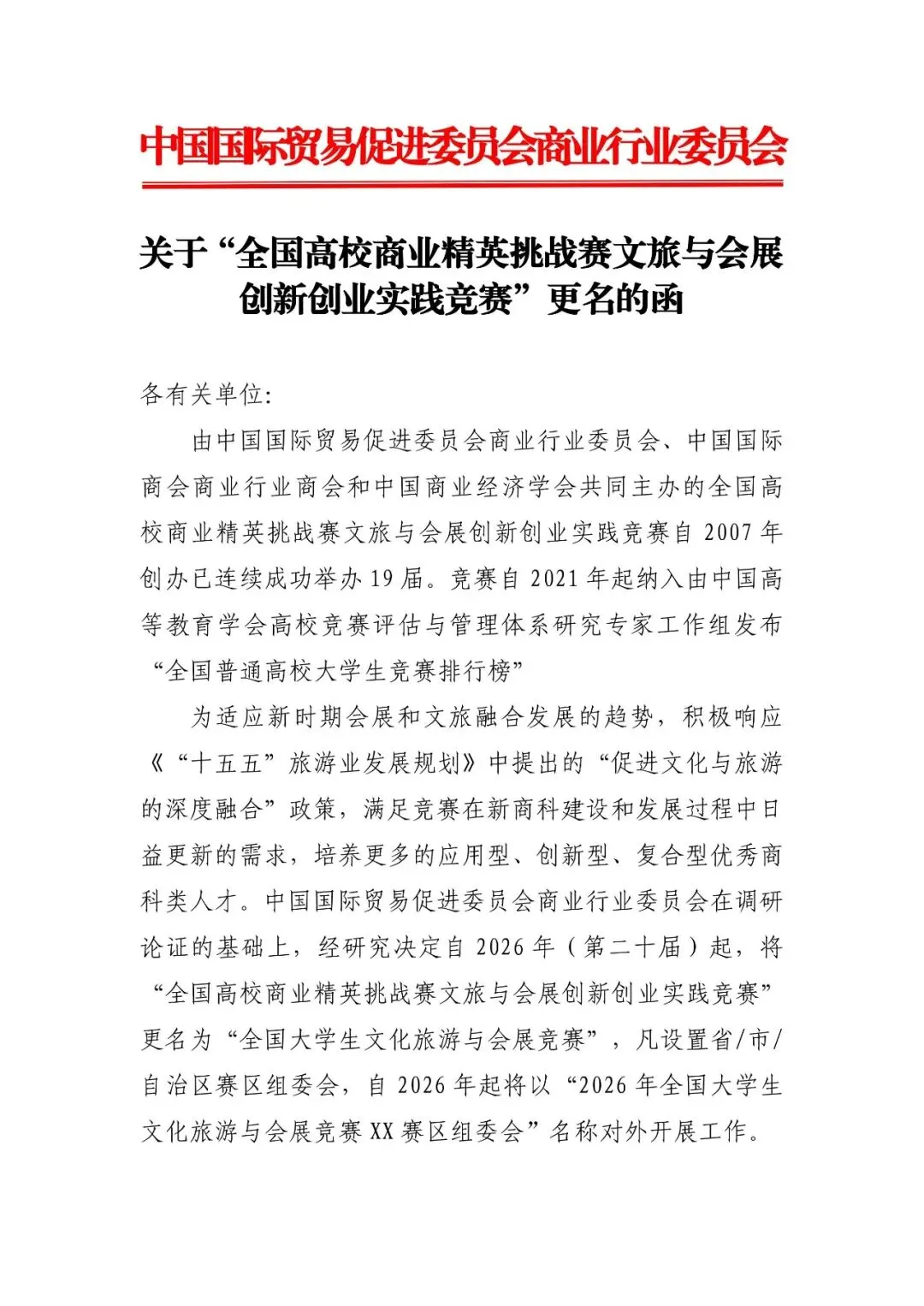 关于“全国高校商业精英挑战赛文旅与会展创新创业实践竞赛”更名的函