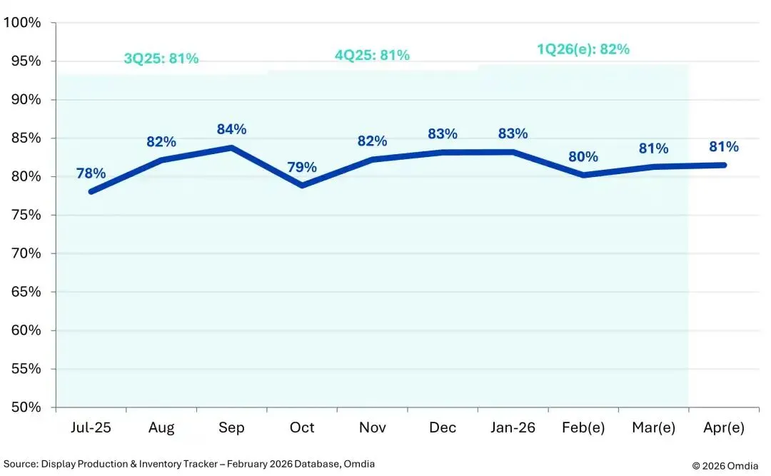 Omdia最新发布的《2026年2月,显示面板产量与库存跟踪报告》,2026年第一季度,显示面板企业连续二个月提高了玻璃投片率,预计将超过上一季度水平。Omdia预测,显示面板企业在2026年第一季度的玻璃投片率将达到82%,高于2025年第四季度的81%。
