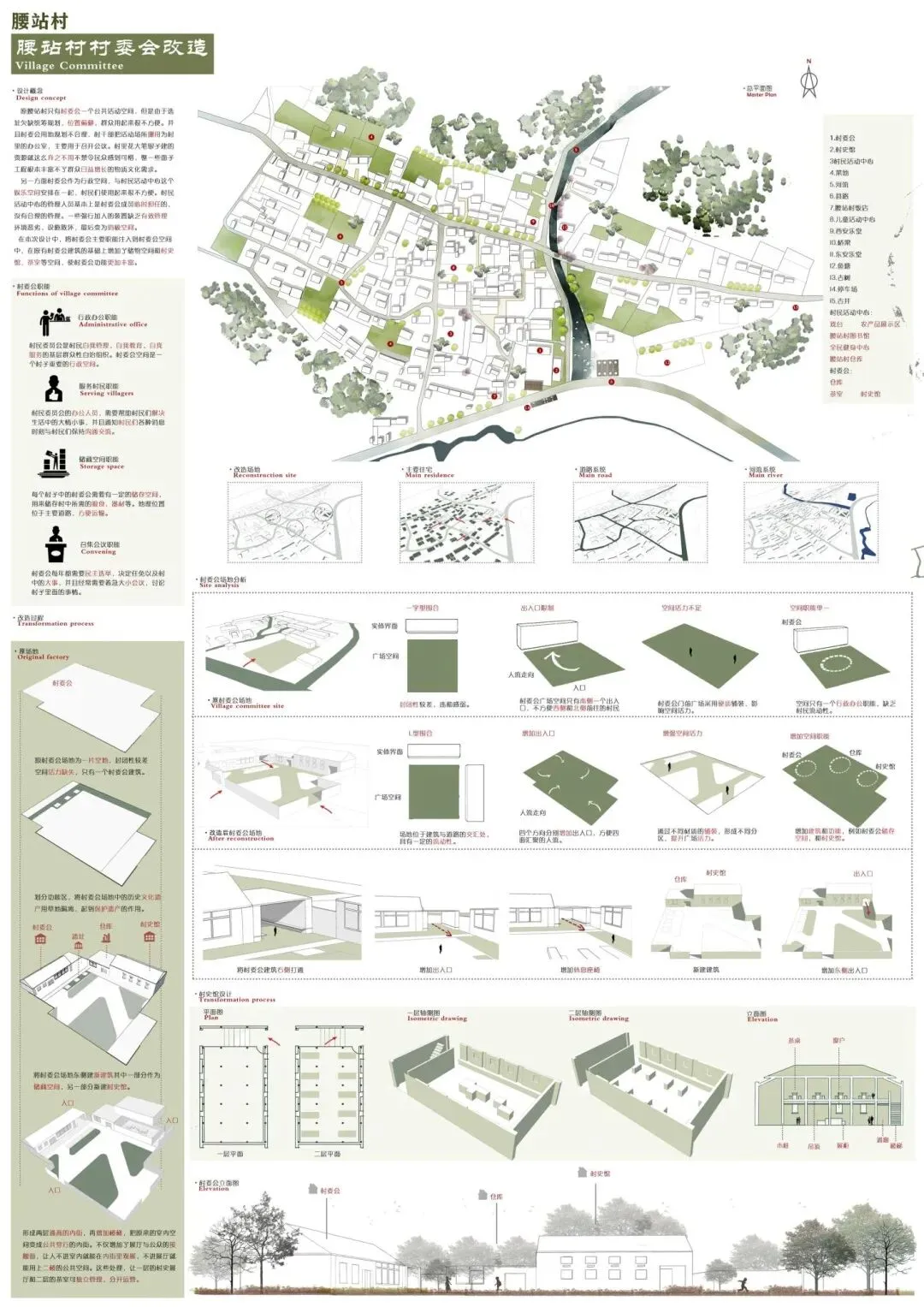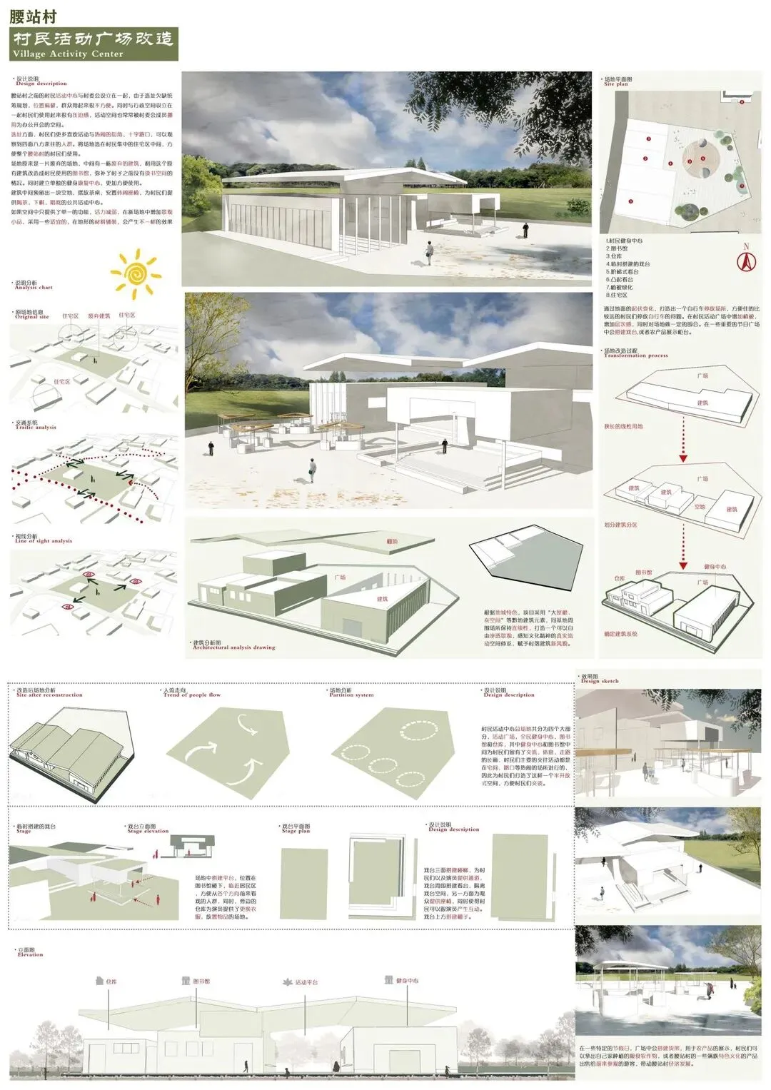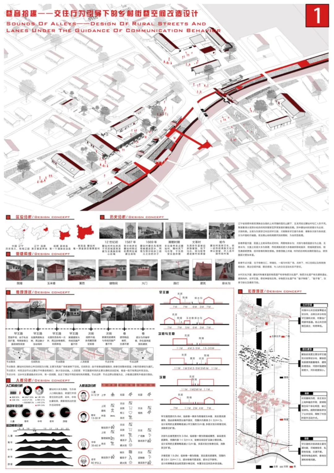设计选址是位于辽宁省抚顺市新宾满族自治县上夹河镇的中国传统村落腰站村,是中国唯一的清皇族后裔聚居村,拥有丰富的文化遗产及历史人文记忆。作者引用触媒理论的设计概念,即分别从文化触媒、社会触媒、业态触媒、生态触媒、时间触媒五个维度对腰站村街巷空间进行了系统化设计。在文化触媒上主要是将当地习俗与文化融入到交往生活中;在业态触媒上主要是通过置入新形式的业态来吸引游客及村民停留时间;社会触媒主要是通过街角退让、消除部分围墙还有通过屋顶坡度调节视线范围等方式来增加公共空间的面积和交往活动的吸引力,从而促进更多交往的发生;生态主要考虑通过雨水景观来实现;而时间触媒则具体表现为400*400mm及400*1400mm两种尺度的DIY模块,村民可通过不同时段的需求进行组装,实现各种功能。在此概念下,方案首先通过打通尽段街巷,划分街巷组团等手法对乡村肌理进行了规划,然后以罕王路和南北主路为轴线,联系街巷各个节点,形成由点到线及面的规划格局。在宏观规划的思路下,设计又对乡村南北轴线、罕王路轴线、两轴线节点安乐堂等进行具体设计,利用现有院墙、建筑、遗迹、文物,从五个触媒维度对环境进行整体提升改造,在触发村民与游客之间交往活动的同时,亦为村民之间的交往留有一定的邻里空间。