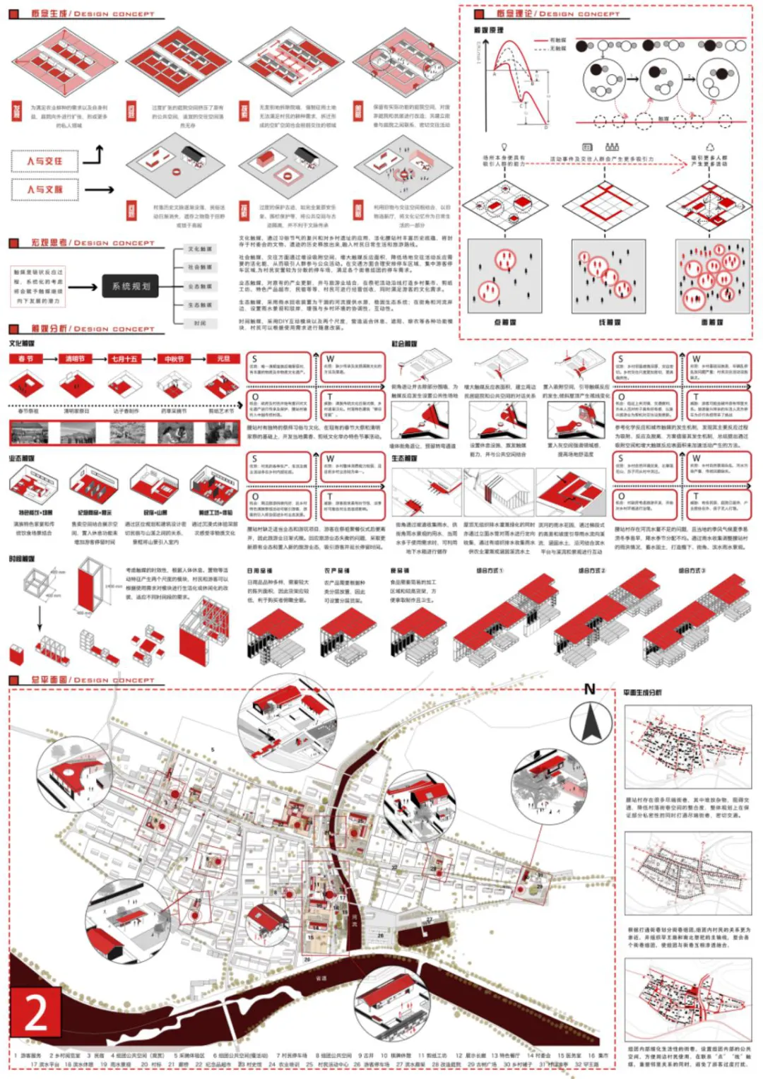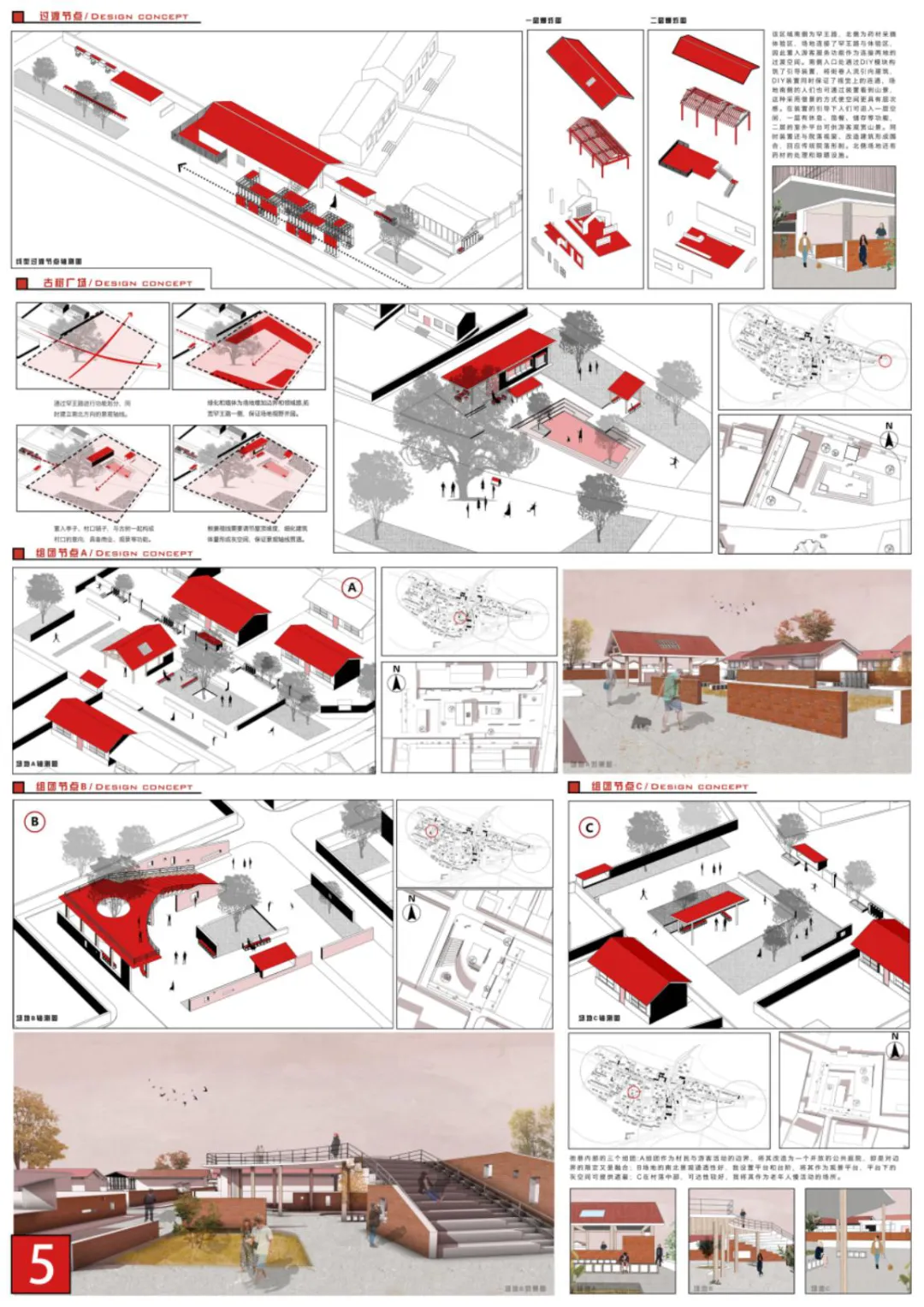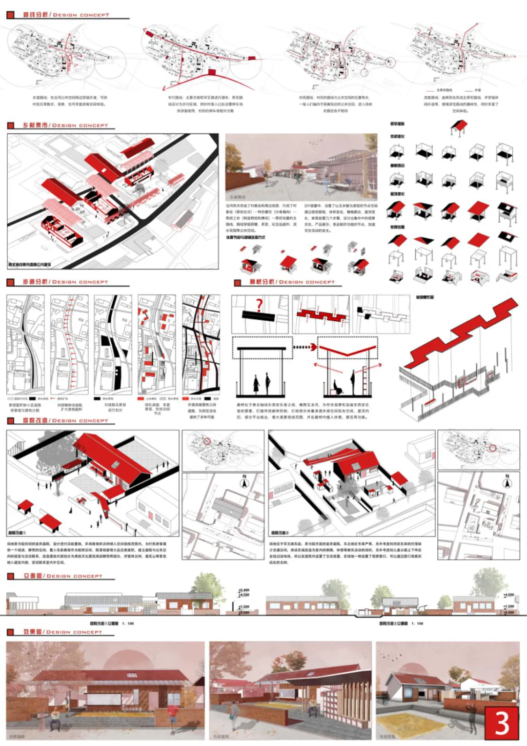 设计选址是位于辽宁省抚顺市新宾满族自治县上夹河镇的中国传统村落腰站村,是中国唯一的清皇族后裔聚居村,拥有丰富的文化遗产及历史人文记忆。作者引用触媒理论的设计概念,即分别从文化触媒、社会触媒、业态触媒、生态触媒、时间触媒五个维度对腰站村街巷空间进行了系统化设计。在文化触媒上主要是将当地习俗与文化融入到交往生活中;在业态触媒上主要是通过置入新形式的业态来吸引游客及村民停留时间;社会触媒主要是通过街角退让、消除部分围墙还有通过屋顶坡度调节视线范围等方式来增加公共空间的面积和交往活动的吸引力,从而促进更多交往的发生;生态主要考虑通过雨水景观来实现;而时间触媒则具体表现为400*400mm及400*1400mm两种尺度的DIY模块,村民可通过不同时段的需求进行组装,实现各种功能。在此概念下,方案首先通过打通尽段街巷,划分街巷组团等手法对乡村肌理进行了规划,然后以罕王路和南北主路为轴线,联系街巷各个节点,形成由点到线及面的规划格局。在宏观规划的思路下,设计又对乡村南北轴线、罕王路轴线、两轴线节点安乐堂等进行具体设计,利用现有院墙、建筑、遗迹、文物,从五个触媒维度对环境进行整体提升改造,在触发村民与游客之间交往活动的同时,亦为村民之间的交往留有一定的邻里空间。