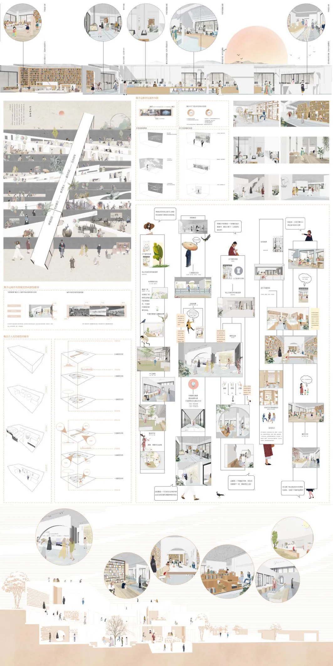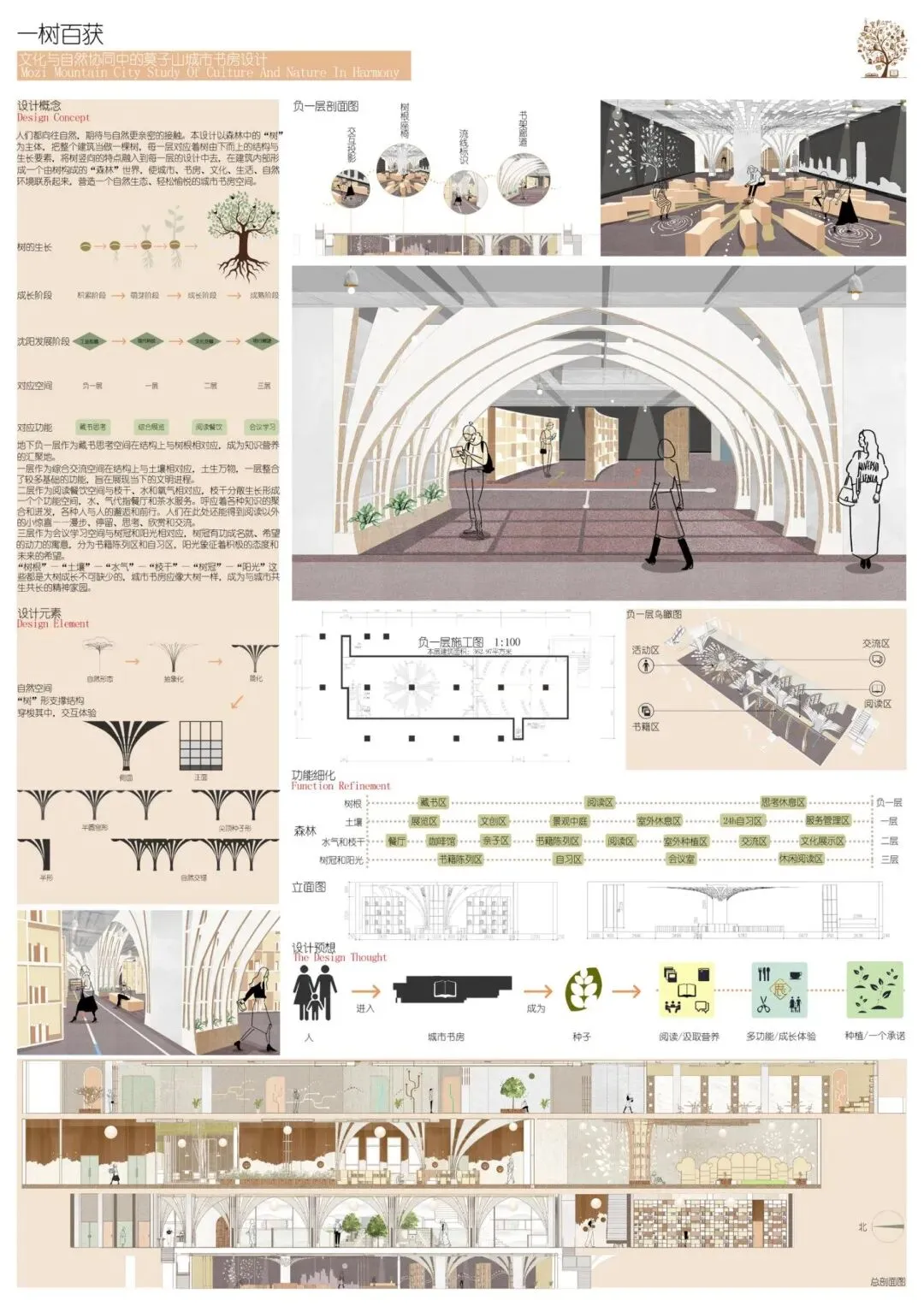 城市书房这样一个巨大的文化宝库,给予人们精神食粮的同时,也丰富了自己。于是我们在设计中将人、树、城市书房三者结合,以人的需求为出发点,以树的成长为主线,以打造满足时代要求的城市书房为目标。