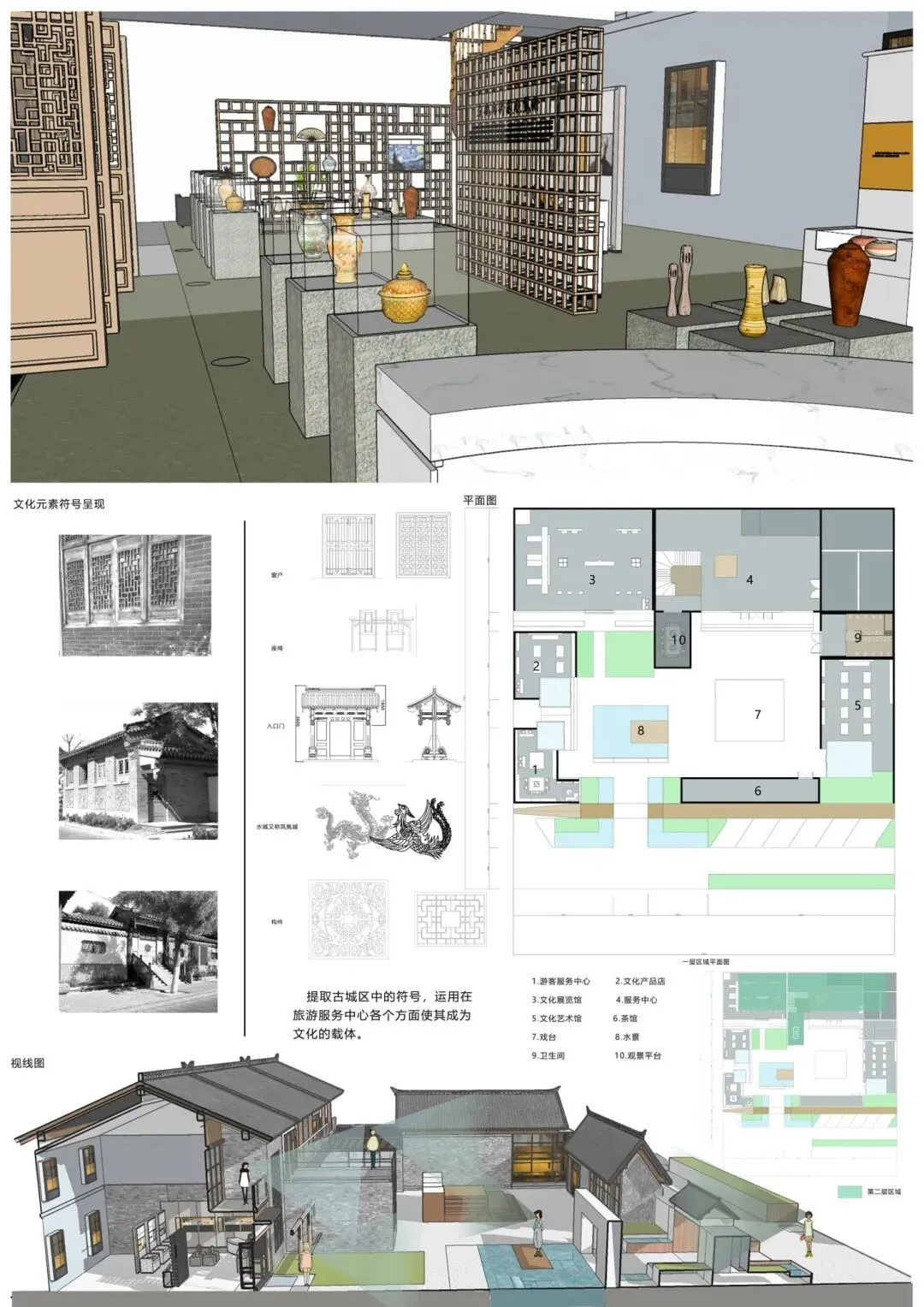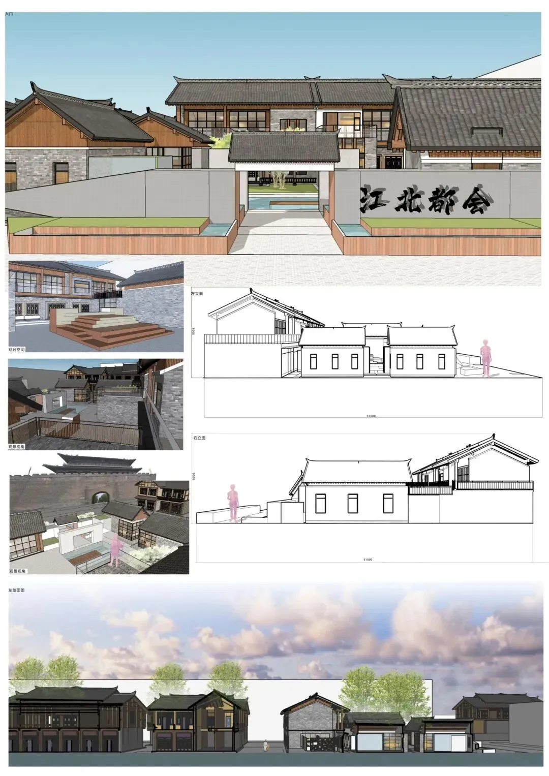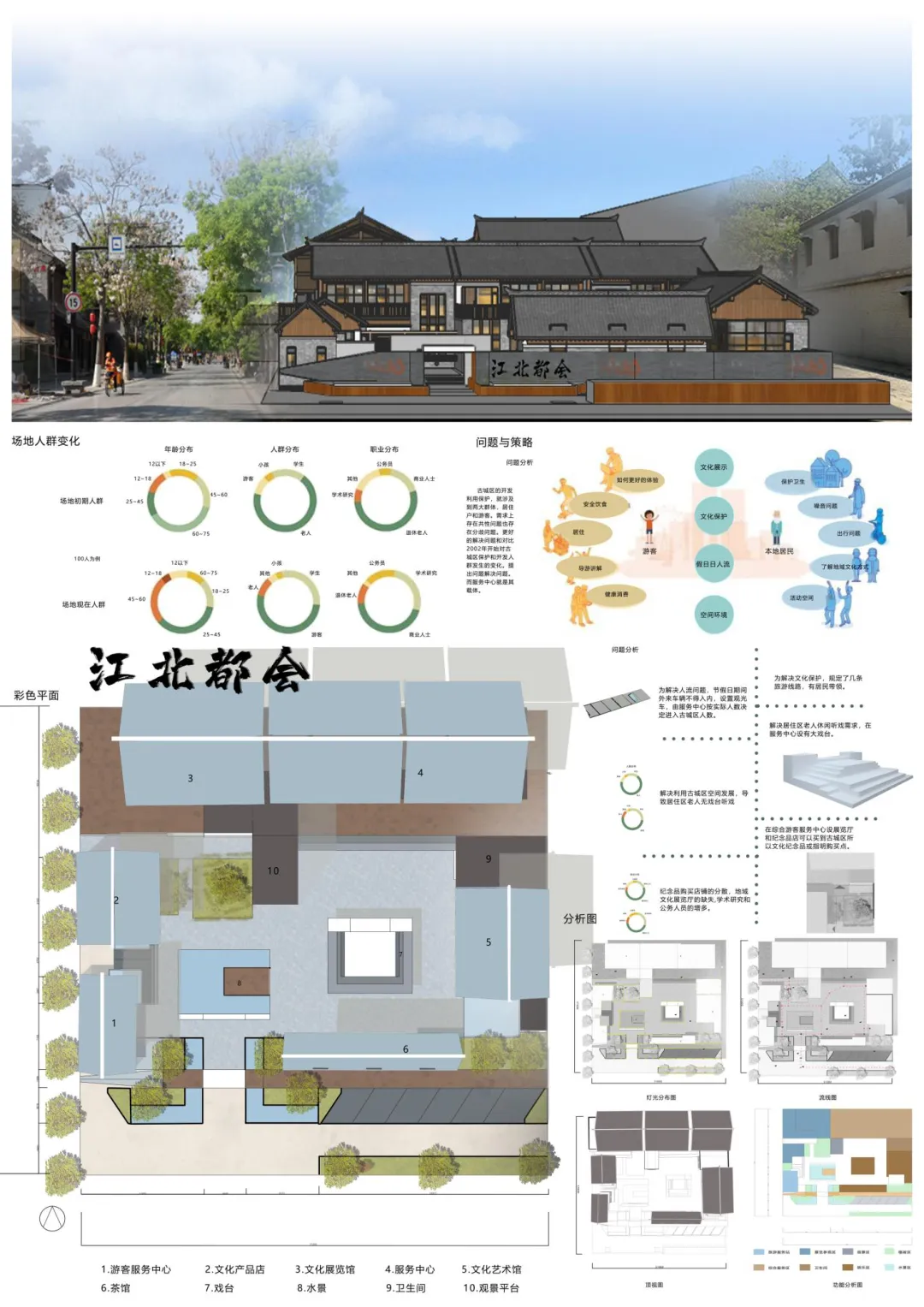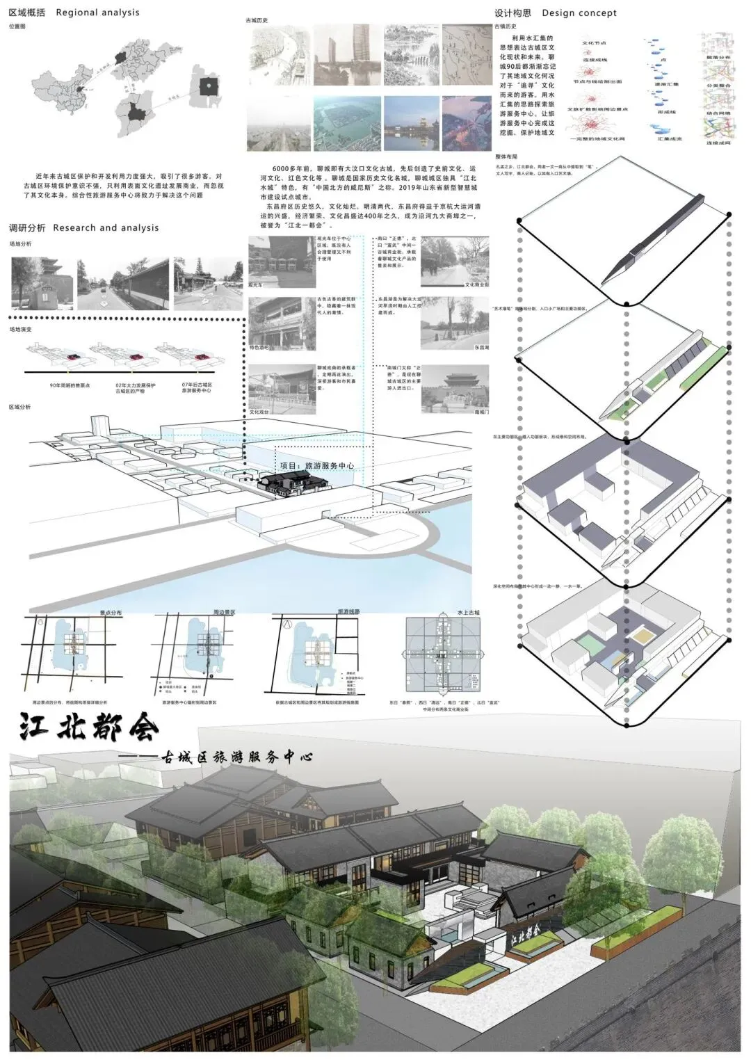 “江北都会”项目在山东聊城古城区,一座四周被湖水围合的水上古城。从2002年古城区大力保护文化传承发展旅游业和特色古城商业街。这里是大运河的重要节点因而曾经非常繁荣。但是现在运河的停运社会的发展,这座古城也不在受人关注。其文化也在快速发展经济阶段遭到严重破坏,近年来聊城人加大保护力度,以古城文化为第一原则的发展商业,形成特色的古城商业街。但也因为旅游业的发展出现了很多问题。使得古城区的文化保护工作一直停滞不前。本次设计就是建设一综合旅游服务中心为古城区商业发展而服务。设计重点主要功能区分为景观节点、旅游服务站、文化销售区、展览区、戏台区、茶馆区、服务综合区、民宿区、卫生间。主入口在南边,也可通过西侧的景观区进去,整体空间布局采用层层递进方式,俯视其建筑所在位置组合成一个“河”字寓意聊城从古至今、从繁荣到衰退都深受大运河影响,也希望现在以运河文化而发展新型商业体恢复往日景象。