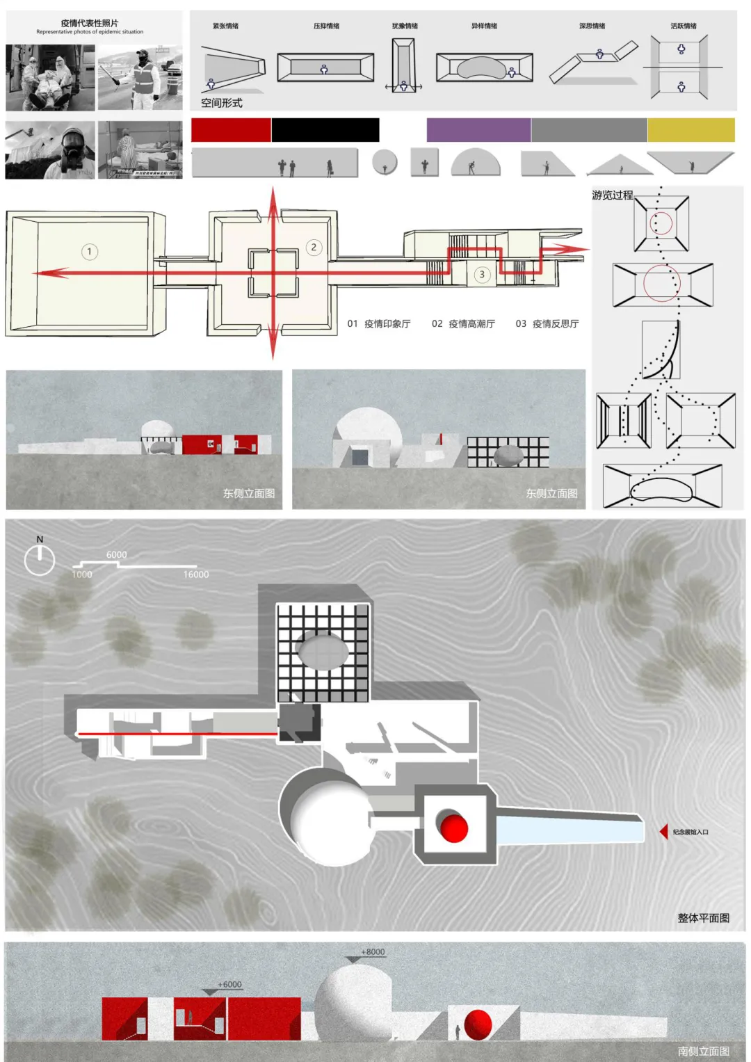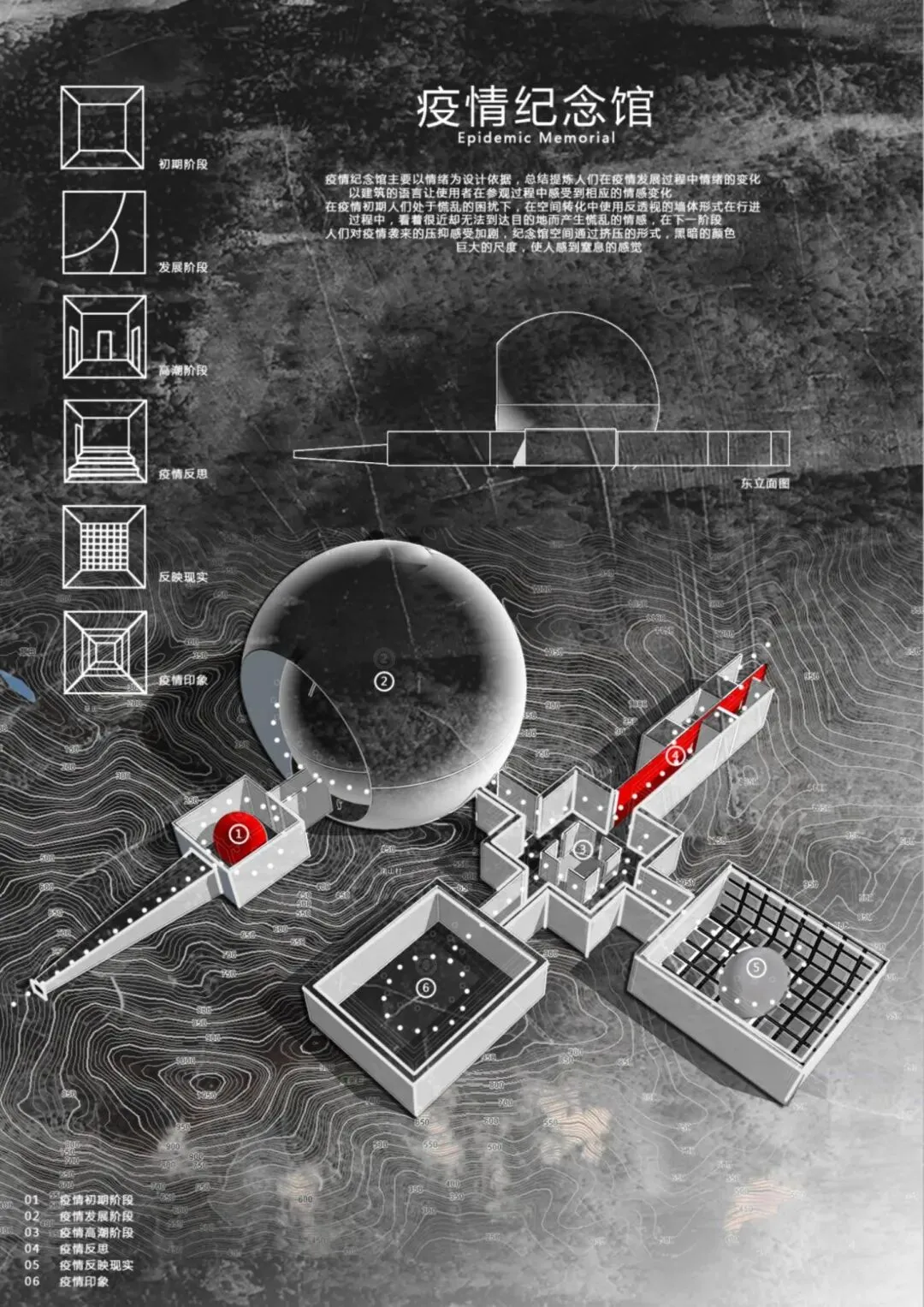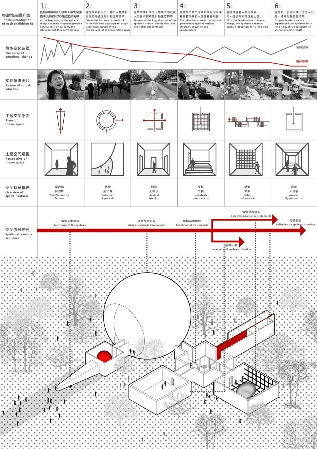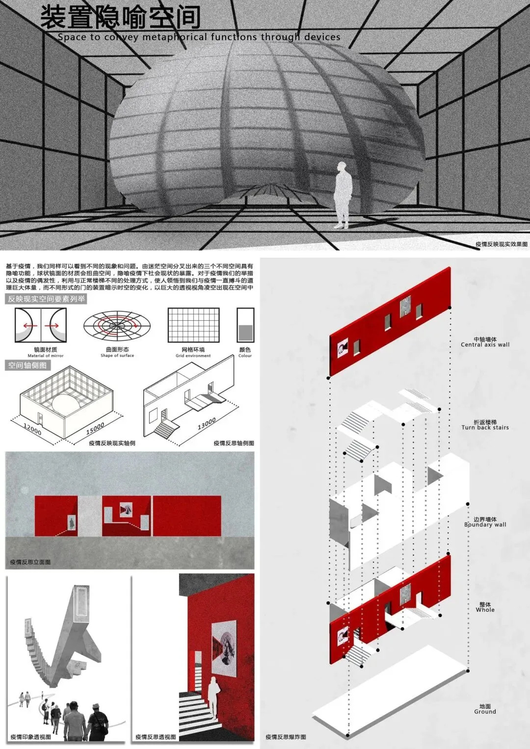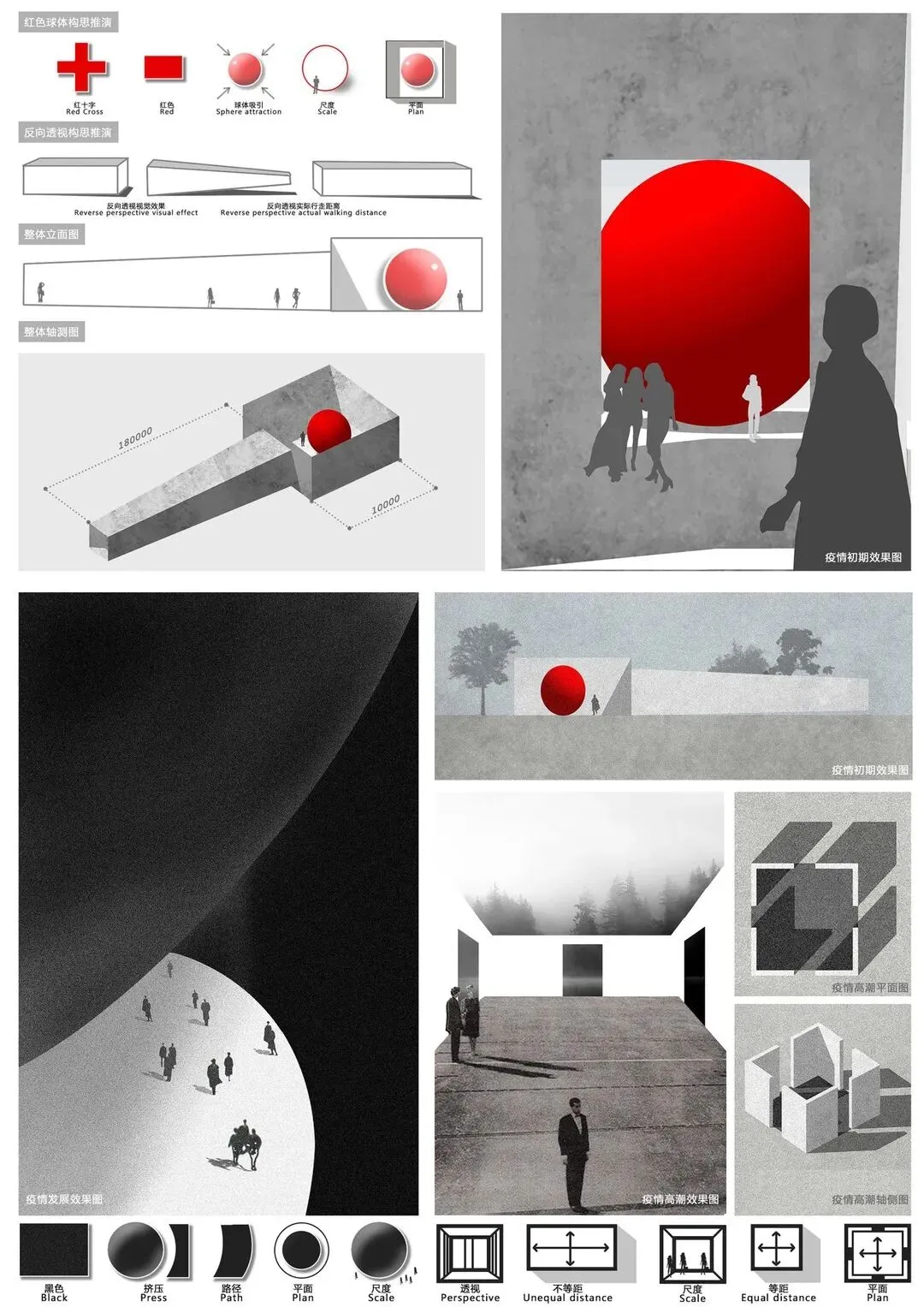 疫情纪念馆主要以情绪为设计依据,总结提炼人们在疫情发展过程中情绪的变化,以建筑的语言让使用者在参观过程中感受到相应的情感变化。在疫情初期,人们处于慌乱的困扰下,在空间转化中使用反透视的墙体形式,在行进过程中,看着很近却无法到达目的地而产生慌乱的情感。而在下一阶段人们对疫情袭来的压抑感受加剧,纪念馆空间通过挤压的形式,黑暗的颜色,巨大的尺度,使人感到窒息的感觉。而同时人们也是迷失的,通过各个方向都有可选择的门,而空间却没有明显的暗示,让使用者不知如何抉择,从而达到迷失的效果传递。基于疫情同样可以看到现象和问题,通过球状镜面的材质会扭曲空间,隐喻疫情下社会现状的暴露。巨大体量不同形式的门的装置暗示时空的变化,而对于疫情我们的举措以及疫情的偶发性,利用与正常楼梯不同的处理方式,使人领悟到我们与疫情一直搏斗的道理。
