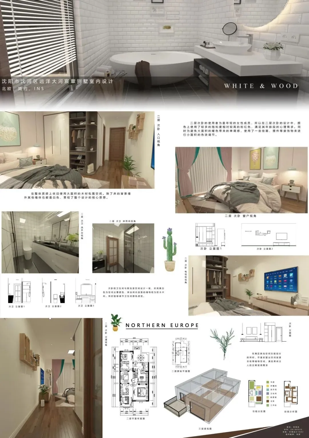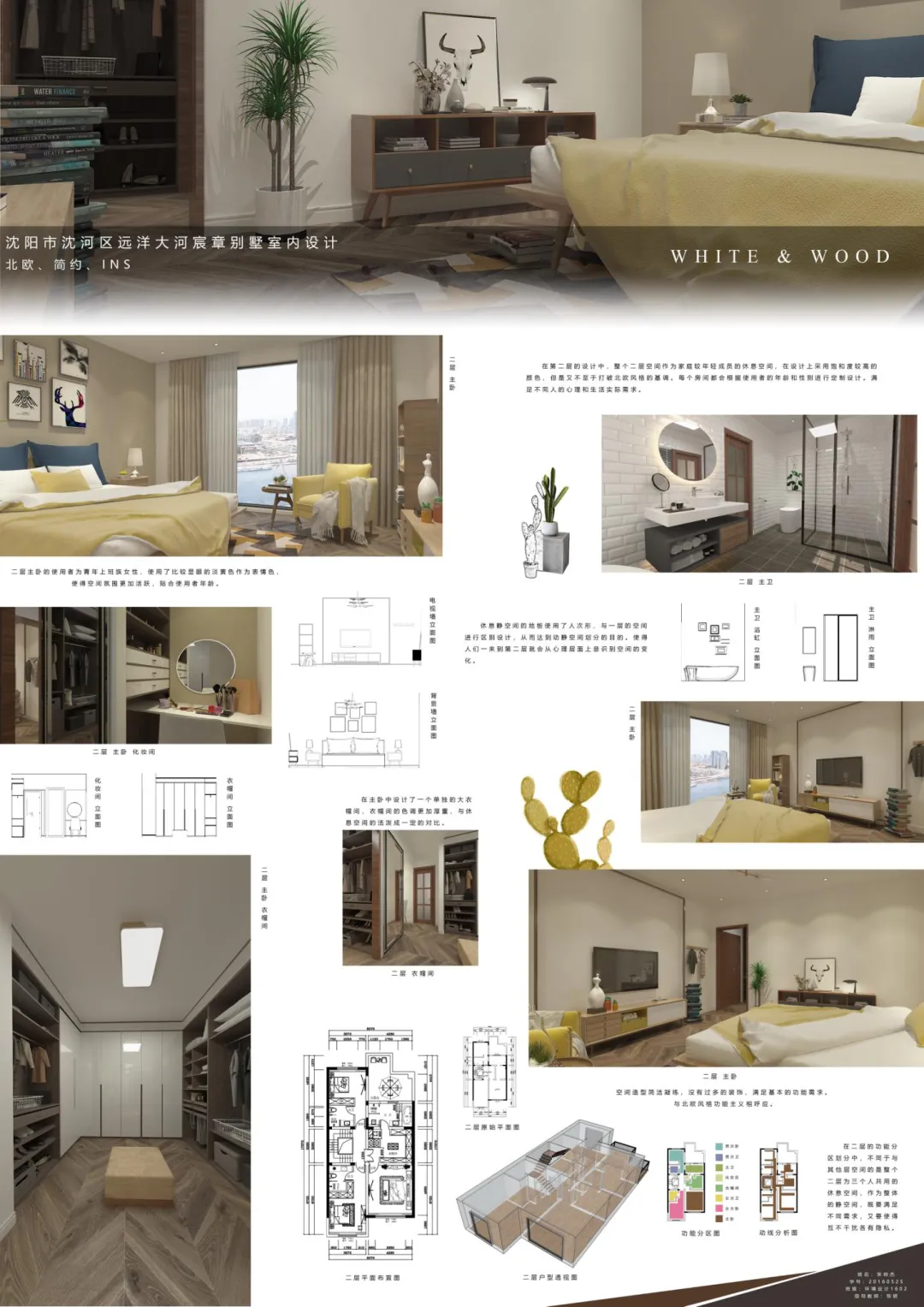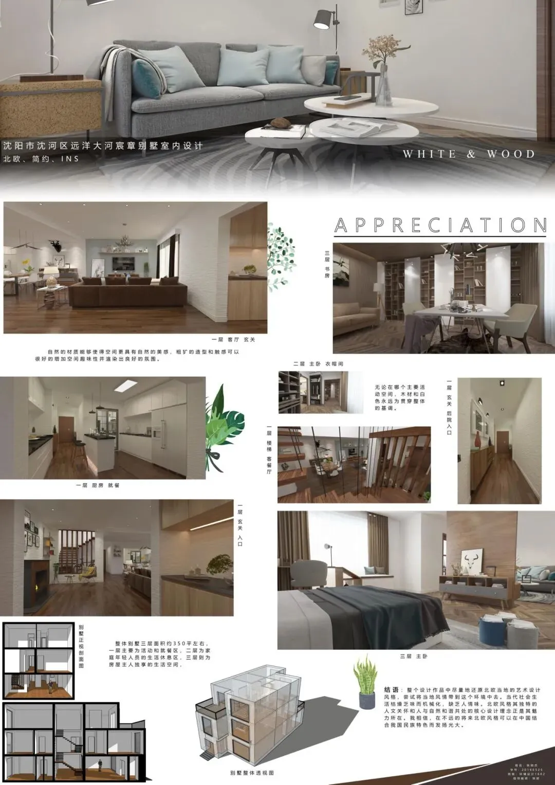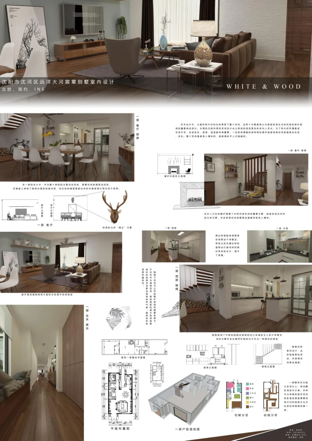 本作品是对沈阳市沈河区远洋大河宸章小区内一栋别墅的设计,一共三层,面积约350m2,大面积的原木质感和白色贯穿整个设计。整个设计想要给人的感觉是充满人情味的、富有温度的。原木和白色的搭配烘托出了包容的、和谐的空间氛围,希望当人们进入到这个空间中有回到家的感觉,在空间功能分区划分上,一层主要作为家庭成员的活动和就餐区,是整个家庭的主要活动场所,留有一个房间供保姆居住休息。二层作为四位家庭年轻成员的生活休息场所,三层为家庭主人的起居和办公空间。将动空间和静空间按照主次关系进行划分,在满足所有人的功能需求的前提下尽量合理地增加空间功能。