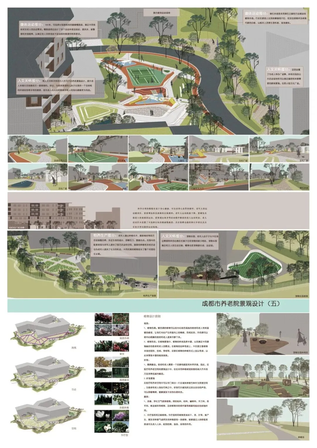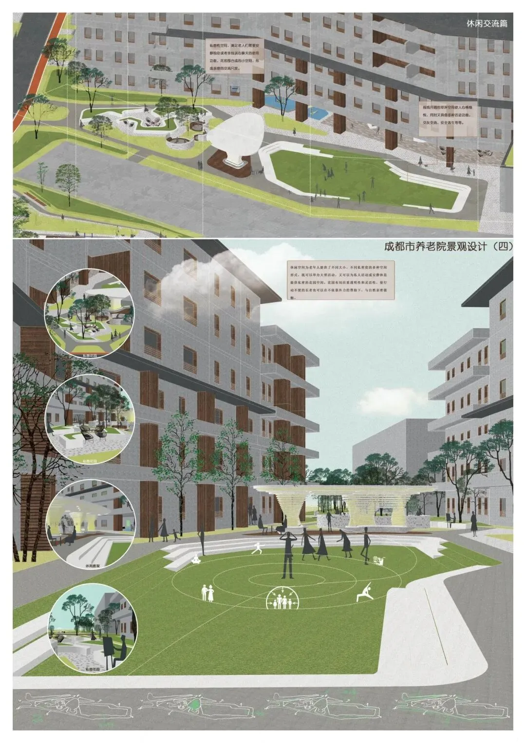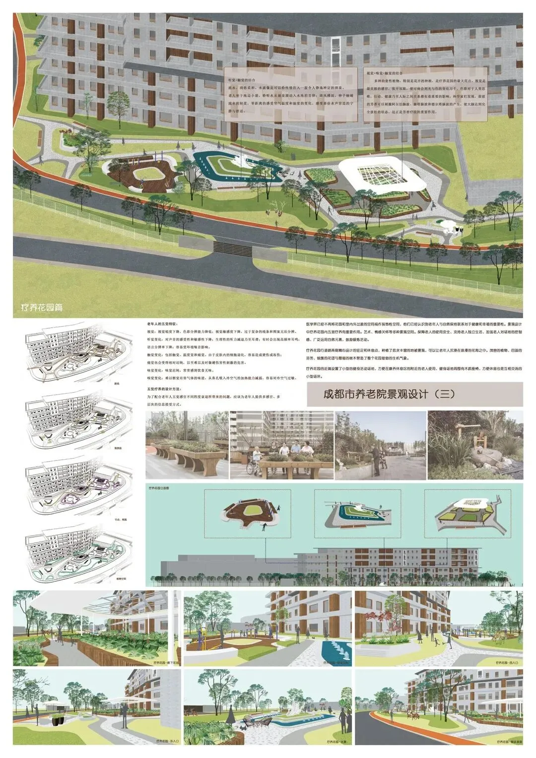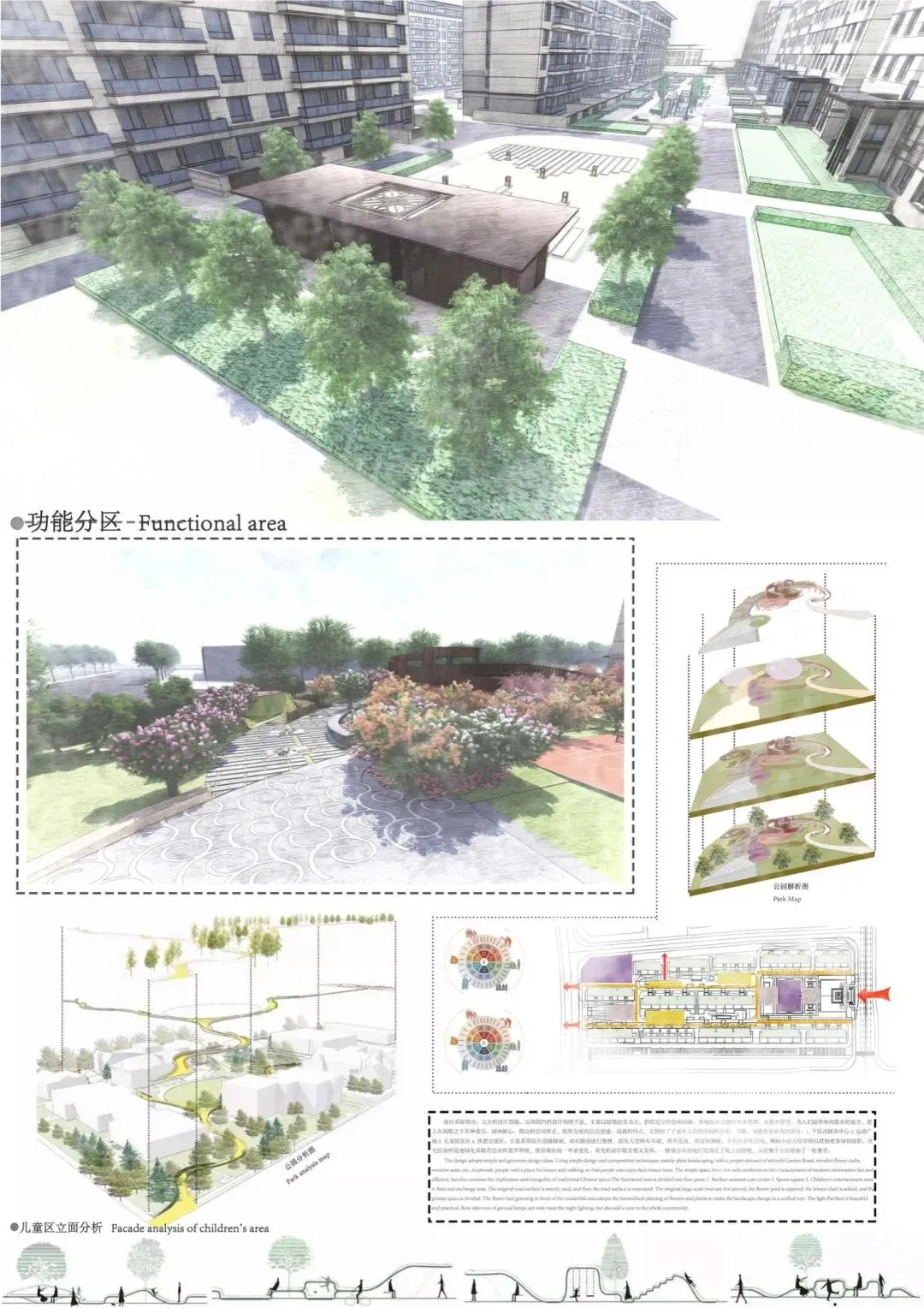 当今社会面临人口老龄化的现状,421的现象越来越普遍,使更多社会问题暴露。如果在社区中的景观设施既能美观又能给老年人带来更多方便,这无疑可以解决很多问题。希望,我们所身处的城市,不仅要成为年轻人为理想奋斗的场所,更要成为老年群体漫度晚年的颐居之地。老年人生活环境营造不仅仅是老年人的诉求,它更多地是一个家庭的诉求。“善”意景观,为老年人而设计,也为将来的自己。设计采取简洁、大方的设计思路。运用简约的设计构图手法,主要以植物造景为主,搭配适量的流畅园路、体现休闲功能的仿木花架、木质坐凳等,为人们提供休闲散步的地方,使人在闲暇之余养神蓄目、绿林醉心。简洁的空间形式,既符合现代信息快捷、高效的特点,又照顾了了老年人传统空间的含蓄、宁静。功能分区分为四部分:1.下沉式颐养中心 2.运动广场 3.儿童娱乐区 4.休憩交流区。主要采用原有道路路面,再对路面进行整修,原有大型树木不动,修葺花池,增设休闲椅,分割私密性空间,林间小道为植草砖以增加更多绿植面积。住宅区前的花池绿化采取有层次的花草种植,使景观在统一中求变化。采光的凉亭既美观又实用。一排排分布的地灯既满足了晚上的照明,又给整个小区增加了一份整齐。