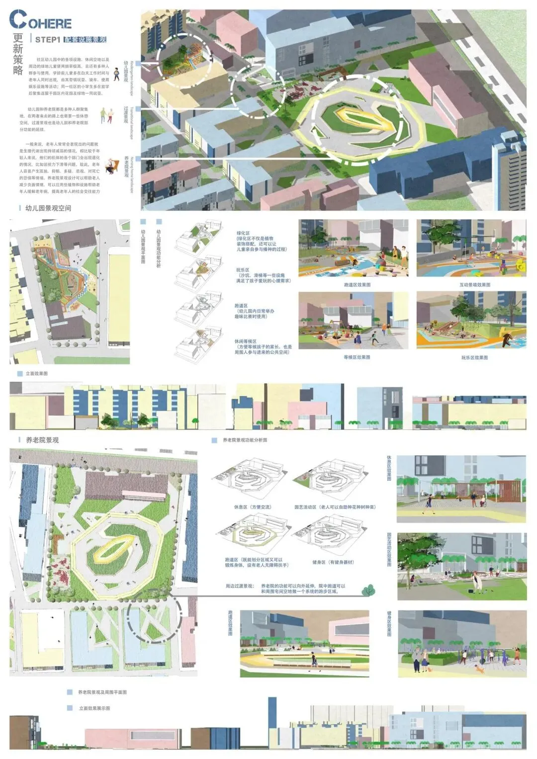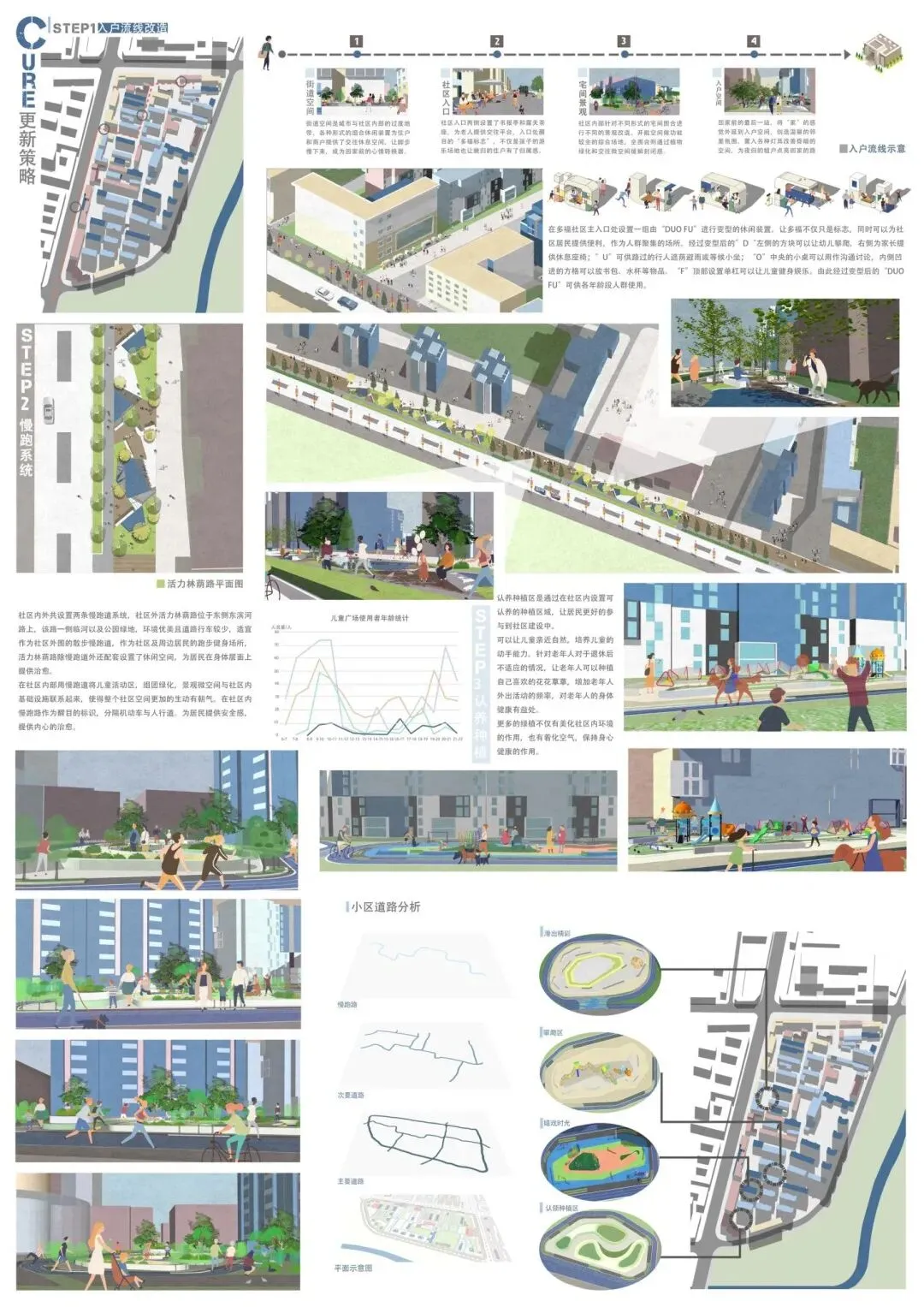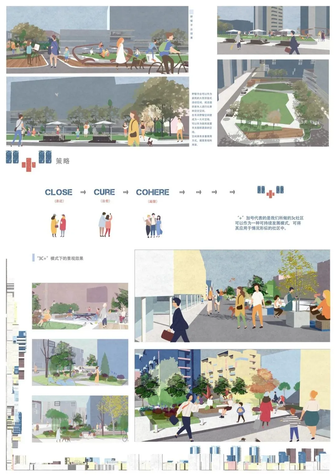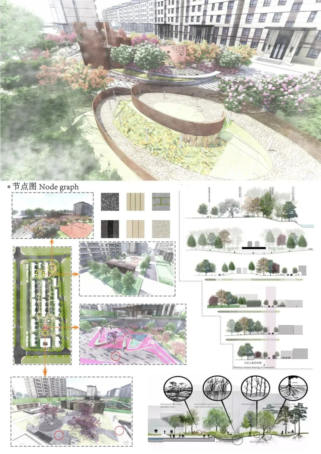该社区是经过整治的老旧小区,社区整体环境较为整洁,但“多福”元素仅仅停留在表面的符号化而没有对社区居民的生活方式和交往模式做出改变。本次更新改造的的定位是“3c+”社区,”3C”表示close(亲近)、cure(治愈)、cohere(凝聚),“+”则代表整个景观的可持续发展力。亲近感可以体现在亲密距离的宅间空间、居民承担的部分绿植与灌溉等;凝聚力可以体现在大尺度的社区活动中心、共享的互动装置设施、完善的配套设施等;在治愈感方面社区设置了内外两个慢跑系统为居民提供健身场地,另一方面可通过园艺活动让居民参与到一个生命的演变中,甚至是植物带来的感官体验。社区的微空间景观系统以及社区边界景观系统,将微空间系统划分为出入口微空间、商住混合微空间、半围合宅旁交往微空间、全围合宅旁交往微空间四部分;社区边界景观系统包括多福之窗、慢生活和活力林荫路三部分。