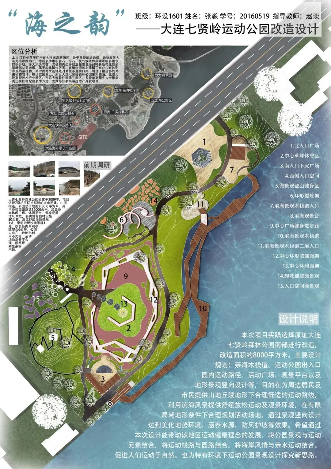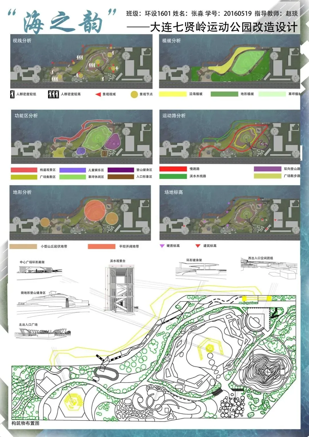 本项目选择原址大连七贤岭森林公园南部进行改造提案,改造面积约8000平方米。主要设计规划包括:亲海木栈道、运动公园出入口、园内运动路径、活动广场、观景平台以及地形景观竖向设计等,旨在为周边居民及市民提供山地丘陵地形下合理舒适的运动路线,利用滨海风景提供舒缓放松的运动场地及观景场地,在有限区域地形条件下合理规划活动场地,通过景观竖向设计达到美化地势环境、涵养水源、防风护坡等效果。希望通过本次设计提案带动该地区运动健康理念的发展,为居民提供体育锻炼与休闲娱乐场所,增加城市绿地,改善城市环境,完善城市绿道系统,满足社会生态需求,让周围住区人们可以逃离钢筋混凝土构筑的灰色城市空间,享受绿色健康的运动环境。通过公园景观与运动元素相结合,将运动线路与园路相结合,将海岸风情与观赏、亲水运动相结合,从而促进人们走进自然、融入自然、尝试运动于自然。同时,竖向设计是运动公园景观设计中一个重要方面,在充分利用地形的基础上对地形进行整合,对各要素进行高程设计。利用地形变化将景观结合,优化资源利用率,降低成本及施工难度,将运动特征与地貌相结合,增强运动公园的景观性,也为特有环境下运动公园的景观探究提供新思路。