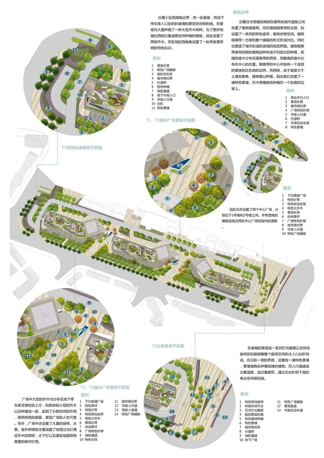 设计场地位于辽宁省大连市CBD区域的西侧边界,是整个CBD区域城市肌理的地标性项目。设计区域总体分为T1、T2、T3三栋住宅楼周围的街区商业景观以及三栋楼顶的屋顶花园,下面通过地理位置叙述景观区域:T1东侧景观由一系列灯光雕塑以及特色座椅区构成。在沿街一侧的界面设置有一堵特色景墙,种植低矮植物。人行通道沿着道路与建筑通过主台阶和下层商业空间相连接。T1楼与T2楼之间分别设置了两个中心广场,且通过铺装连接中心广场与园内的道路。T2楼与T3楼的广场中大型乔木分布在底下车库支撑柱的上方,与其他较小型乔木和种植池一起,起到分割空间的作用,,提供树荫遮蔽,塑造广场的人性尺度。另外广场中还设置了大量座椅和水景。室外照明主要涵盖地埋泛光灯满足乔木照明,水下灯以及满足地面照明需要的草坪灯等。T3西侧街道沿着小区西南角边界有一处缓坡,将地下车库入口处的斜坡墙与景观空间进行衔接。在缓坡内种植大量大型乔木,为了更好强化西侧沿着道路空间的植被,设置了两排乔木。区域西南角设置了一处带夜景照明的特色标识。1-3号楼均设置有屋顶花园,花园的设计首先通过在通向屋顶花园的台阶一侧设置特色景墙和水景,来强调突出出入口,在台阶另一侧设置玻璃幕墙,一方面与建筑立面相呼应,另一方面也很好的掩饰内部结构层,而廊架顶部,则使用轻质的材料和结构。主要设计风格以简洁现代、休闲精致的景观性格为主,通过“少就是多”理论的诠释以及现代科技的利用,在景观都市主义和极简主义等理论的指导下,场地设计满足生态、人性、多元、创新的要求,完整体现城市、建筑与景观集合的多元一体综合目标。