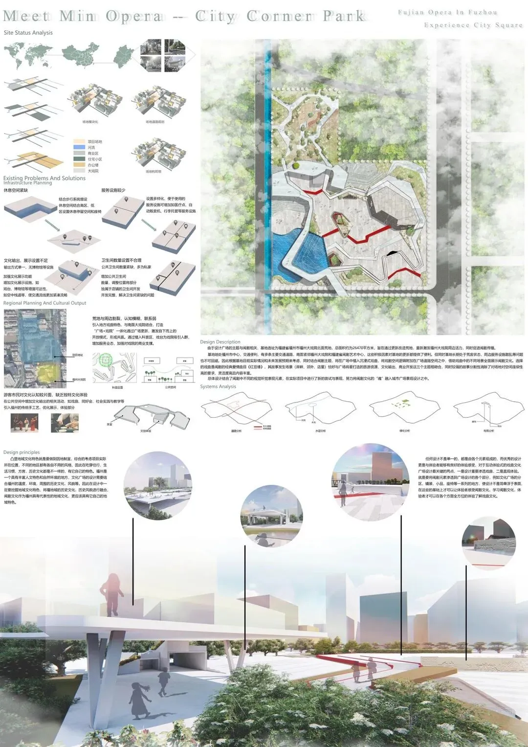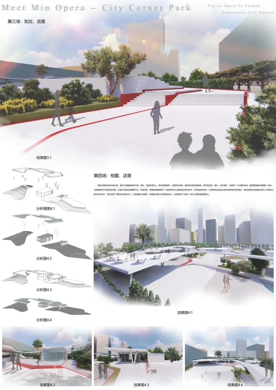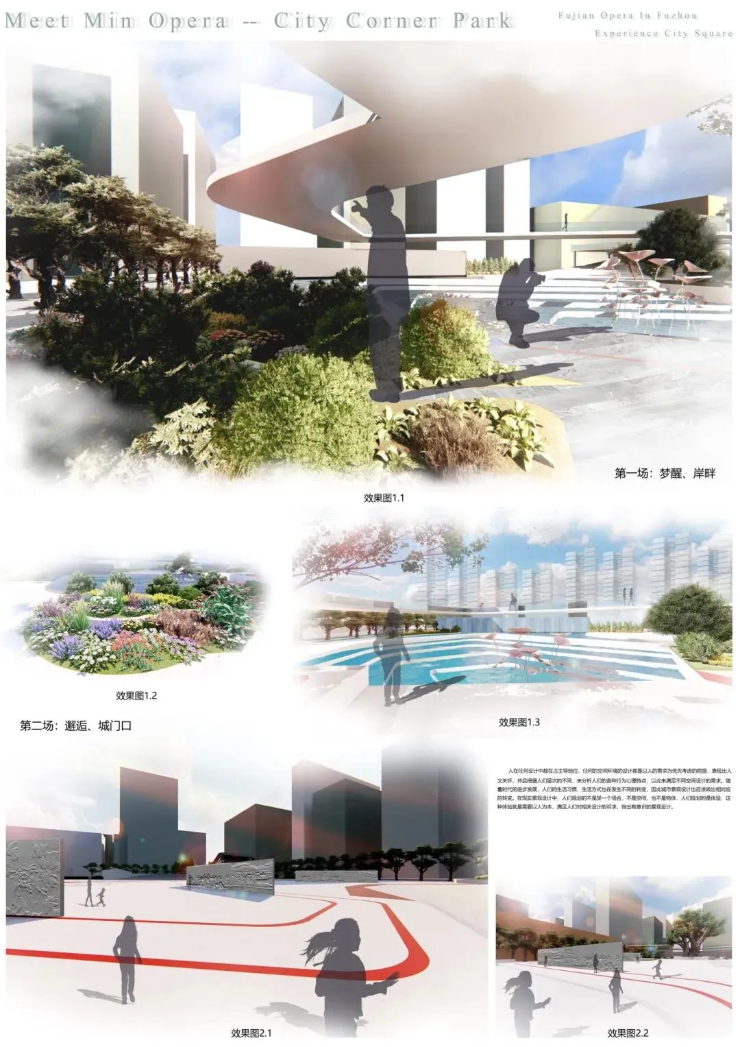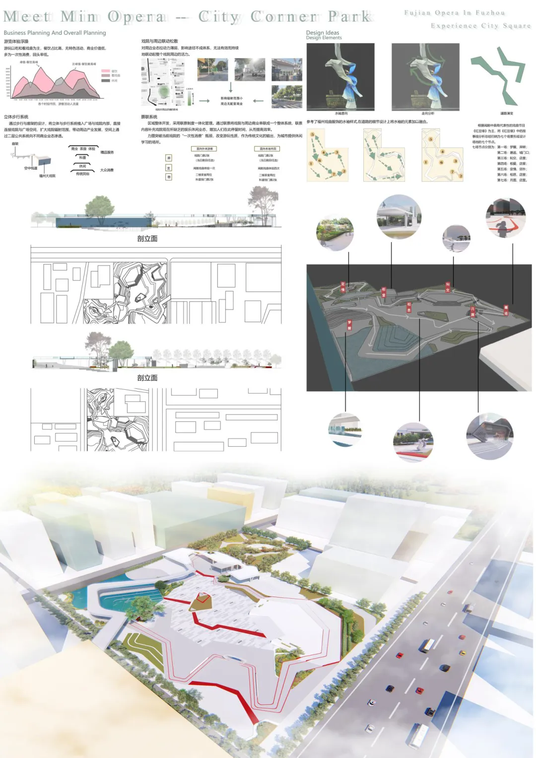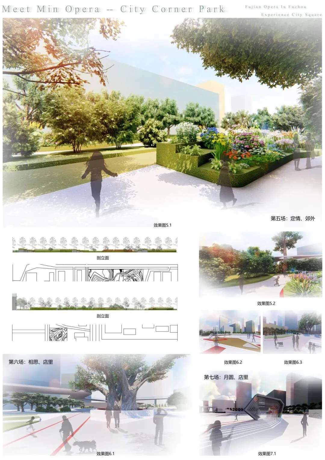 由于设计广场的主题与闽剧相关,基地选址为福建省福州市福州大戏院北面荒地,总面积约为26470平方米,旨在通过更新改造荒地,重新激发福州大戏院周边活力,同时促进闽剧传播。基地地处福州市中心,交通便利,有多条主要交通道路,南面紧邻福州大戏院和福建省闽剧艺术中心,这些积极因素对基地的更新都提供了便利。但同时基地长期处于荒废状态,周边服务设施散乱等问题也不可回避。因此根据基地目前实际情况和未来发展预期来考虑,同时结合闽剧主题,将在广场中植入沉浸式戏曲,将戏剧空间逻辑附加在广场道路空间之中,借助戏曲中的不同场景全面展示闽剧文化。选择的戏曲是闽剧的经典爱情曲目《红豆缘》,其故事发生场景(岸畔、郊外、店里)恰好与广场将要打造的旅游资源、文化输出、商业开发这三个主题相吻合,同时较强的故事分割性消除了对场地对空间连续性高的要求,灵活度高且内容丰富。文化输出方面:通过在广场设计中设置戏台、闽剧体验馆、文化墙等空间设施,增加闽剧相关文化输出,剧本同好会、社会实践与教学等,同时引入福州传统手工艺,如茶艺等,优化展示、体验部分,在广场中散布,串联各层动线。旅游资源方面:戏剧情节与广场空间结合,使得各个景观节点个体上既有突出,也能达到整体和谐,让游客在游览感受穿越千年的爱情故事,体会他们的喜怒哀乐。同时根据戏曲情节,在第一、五、六、七幕进行景观改造,打造水池、后花园、中心广场等景观节点,同时根据《红豆缘》故事主题设计相应景观雕塑,增加游客停留时间。商业开发方面:将广场与福州大戏院通过廊道连接,设置闽剧文创店、体验馆等,将原先孤立、割裂的商业动线重新设计,使整体动线连续成环,增加广场与戏院的联系的同时,增加广场内部商业空间的可视性与可达性,提高商业价值。同时打造“联票系统”,力图突破当前戏院“一次性消费”的瓶颈。总体设计结合了闽剧中不同的视觉听觉表现元素,在实际项目中进行了新的尝试与表现,努力将闽剧文化的“魂”融入城市广场景观设计之中。