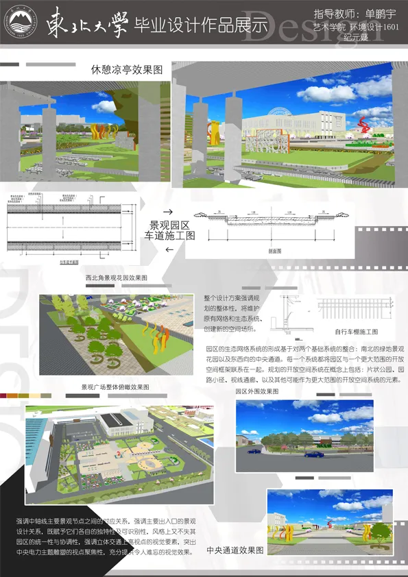 设计项目名称为扬中市电力工业厂区景观设计。设计选址位于江苏省镇江新区。选址总面积大概约为15000平方米。设计基本功能分区拟定为主题入口,休憩区域、雕塑水景、绿化、交通功能区。设计核心概念为在满足厂区生产、交通功能的前提下,根据扬中市电力工业厂自身的文化与特点,以体现人文关怀、展示企业的内涵、生态环境的可持续发展为主旨,将园区广场定位为“绿色流动空间”,并引进了自然能源和与规划网络有机共生的设计,在厂区景观的设计中摒弃传统的单一的手段,针对特定的园区场所和规划后的地块关系,发挥景观对于整个土地的柔性串联特性,体现园区的特征,配合前沿的设计理念,深化企业的精神内涵和行业属性。整个设计方案强调规划的整体性,将维护原有网络和生态系统、创建新的空间场所,形成了单纯明晰的流动空间组成关系,体现绿地空间对的依附性及发散性关系,每一个系统都将与一个更大范围的开放空间框架联系在一起。同时,还将构筑物的建筑行为都纳入到统一的空间脉络之中,相互渗透,形成了一个完整的绿化生态流动网络,使园区的景观空间与建筑空间和谐统一。设计表达采用手绘与电脑结合表达,展示内容包括创意草图,效果图,手绘稿、电脑效果图,正式展板等等。